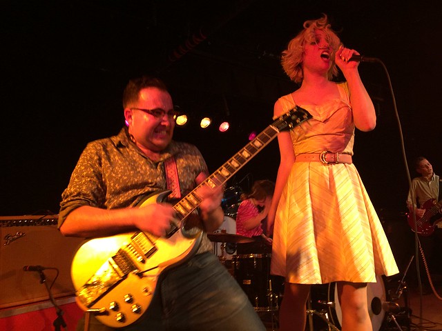 On my side of the stage, the show is dominated by guitarist Gideon Jaguar, who plays like a man possessed, melodically mixing sounds of punk, rockabilly and surf rock into a continuous stream of thunderous strings. The man is unstoppable, and he’s a blur of motion for most of the set as he bounds upstage and downstage from song to song. Gideon is a showman, and he’s really really good.