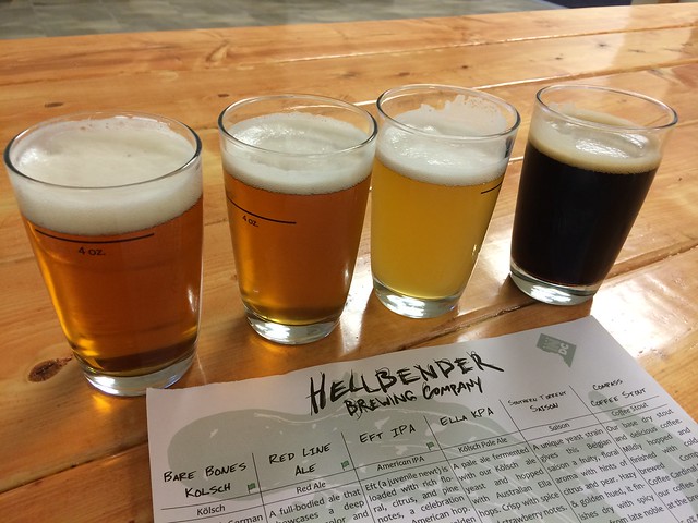 Get a flight of four beers ($6) and sample away in the well-designed, and not too small tasting room. Also see the Hellbender Tap Finder.