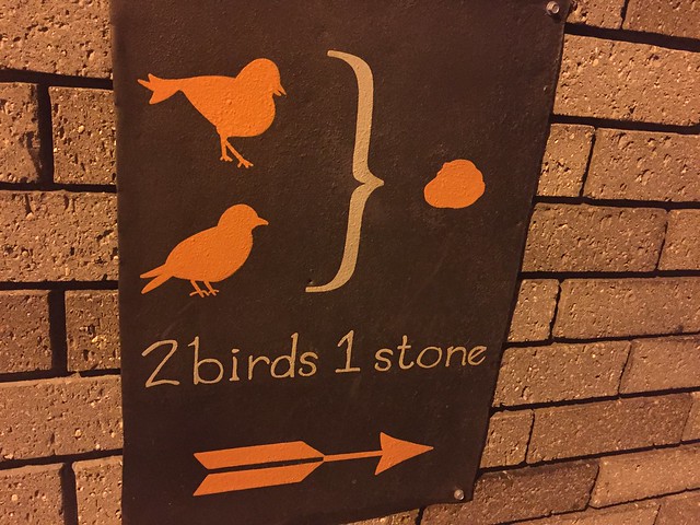 A simple sign marks the subterranean entrance to 2 Birds 1 Stone.