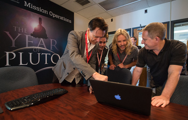 Lawrence Gowan (left), Todd Sucherman, and Tommy Shaw of Styx and Alan Stern, New Horizons principal investigator, chat at The Johns Hopkins University Applied Physics Laboratory in Laurel, Md., on July 1, 2015. (Photo courtesy NASA)