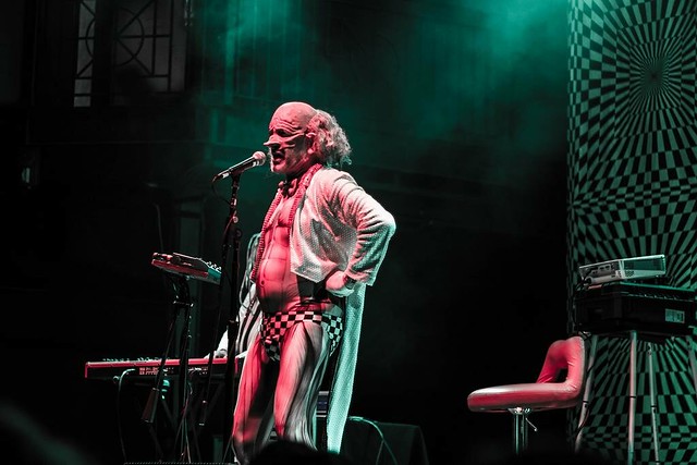 On Friday, a trio steps to the stage, rather than the quartet-plus-ensemble-of-supporters from days past. They introduce themselves as Randy, Rico, and Bob (Chuck having retired from touring, it would seem). In identifying themselves by name, as they have in recent years, The Residents have pierced their legendary anonymity (unless it’s all part of the artifice, and these are once again just characters). Their attire is simpler. Each member’s face is covered to varying extent with stylized death masks and a rubber skullcap. They wear white sequined tuxedo jackets over what ranges from black and white Beetlejuice stripes to a one piece latex body suit and speedo.