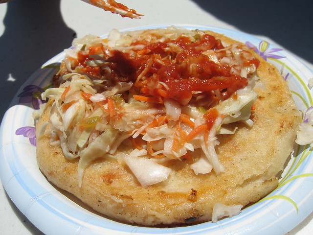 I first experienced pupusas in small, neighborhood restaurants in San Salvador, El Salvador in 2005. They served them piping hot for around $.30 each. On the table was a giant jar of curtido (the cabbage slaw) and squeeze bottles of the salsa roja. I ate them all, everyday.