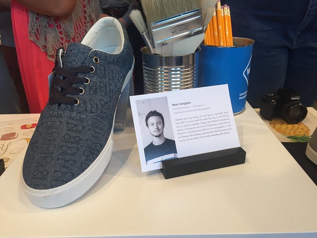 Each pair of shoes sold by BucketFeet, whether for men, women, or children, bears a unique art pattern created by an individual artist. And as a customer, you can read a bit about the artist on an accompanying placard, such as shown in these pictures taken by us in a grand opening party at BucketFeet on Wednesday: