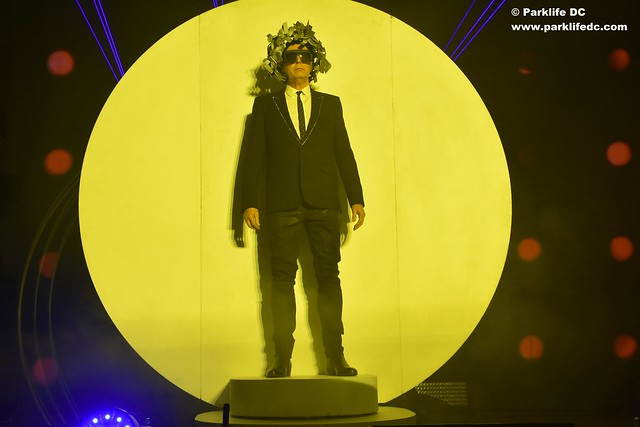 At the beginning of the show, Neil and Chris make a clever PSB-type entrance as they rotate into view on separate platforms, which then serve as screens and light reflectors for the first part of the show. The duo wear elaborate headpieces, and Chris’ covers his entire head in an otherworldly manner. Neil takes to the microphone for “West End Girls,” and the sold-out crowd at the Warner is deliriously happy from the first note.