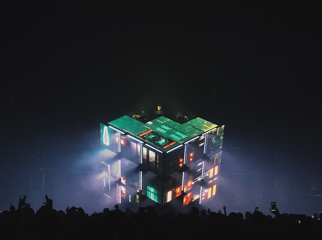 Appearing on his “lots of shows in a row” tour, Deadmau5 performed from his “2.1 cube,” a massive, two-story, LED cube with special reinforcements. The special requirements limited the number of venues available to host his show. There was a huge age range in the crowd to catch sight of the trance music icon from infants to ancients… and boy was it a show.