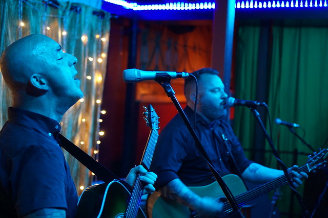 About halfway through his set, the PA system malfunctioned, causing the sound guy to jump on stage to fiddle with cables. This did not stop the show. As Trevor, the sound guy, went into repair mode, Dan started picking the intro to the song “Fine” from Alkaline Trio’s album Crimson. Last time I saw this song played live, Dan was playing Matt Skiba’s guitar, Derek was on the bass, and Matt was on the drums.