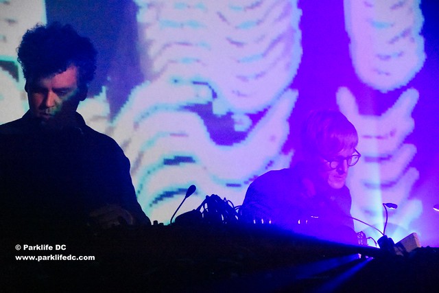 In the pitch black darkness of the Armory, Simian Mobile Disco created luminescence through their techno melodies. Soon, the duo put dancers in the zone with the familiar sounds of selections like “Cerulean” from 2012’s Unpatterns. A fat “whomp” set the beat with the bass in the background, while a structured melody materialized as if the wound were water flowing from their synthesizers. An intricate light show flashed in time to the music.