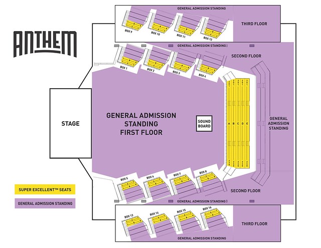 Super Excellent Seats are non-transferrable. Concert attendees must pick up their Super Excellent Seats tickets at The Anthem box office on the night of the show. According to IMP, these balcony seats are uniquely angled to face the stage at the exact perfect position.