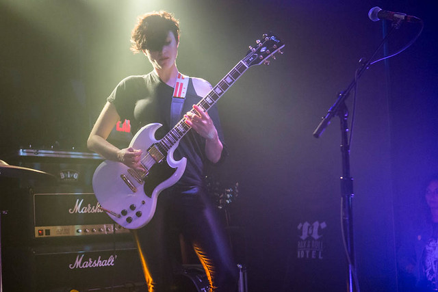 The dynamic Betsy Wright, bassist for Ex Hex, launched another band last year, forming Bat Fangs with drummer Laura King. The band performed as a trio opening for War on Women at Rock and Roll Hotel on Saturday, Aug. 26, and Paivi got some pix. (Check out her pix of War on Women also.)