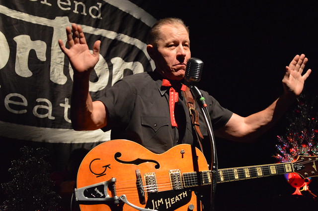 The Reverend Horton Heat (Jim Heath, among friends and accountants) hit the stage in a poinsettia-red tux jacket and tie, firing off riffs around the melody of “We Three Kings.” To his left was long-time bandmate Jimbo Wallace on the standup bass, and behind him the band’s new drummer Arjuna “R.J.” Contreras. To his right, special guest Matt Jordan (aka “Powder”) hammered the keys on a bright red piano, bringing a little New Orleans honky tonk to the Rev’s Texas stew.