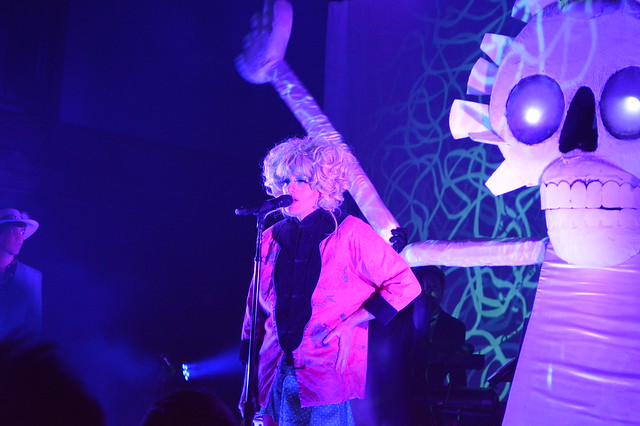 The first to appear is a bleached marshmallow skull with glowing eyes and enormous arms. It lazily beckons us into its lair and introduces us to our host. Vaulting onto the stage is the band’s central member and creative force — Kevin Barnes. He appears at first as a garish cross between Hedwig and Patsy Stone, with heavily painted features and an enormous blonde Dolly Parton wig. His energy is frenetic as he launches into “Gronlandic Edit” from 2007’s Hissing Fauna.