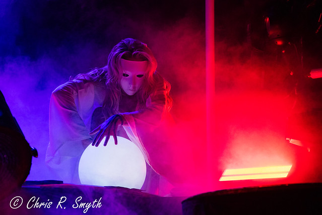 The show culminated with the song “Whore.” Frontwoman Maria, wearing a dunce cap with the word “whore” written on it, stood behind a pulpit with SIN seemingly painted in blood on the front. Both backup dancers wore anonymous white masks with “blood” pouring from the eyes and signs around their necks with the word “shame.”