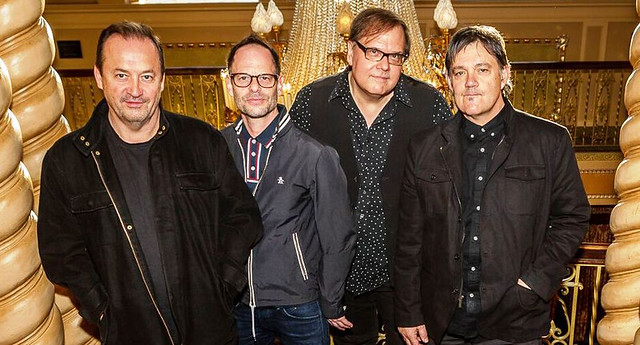 The Smithereens for the State Theatre show, left to right: Jim Babjak (guitar), Robin Wilson (lead vocals), Dennis Diken (drums), and Mark Mesaros (bass) (Photo courtesy Lappen Enterprises)