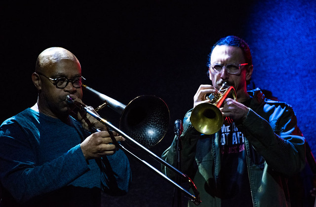 The Beltway Horns (Greg Boyer: trombone; Brad Clements: trumpet) perform at Southwest Soul Sessions on March 24, 2019. (Photo by Mark Caicedo)