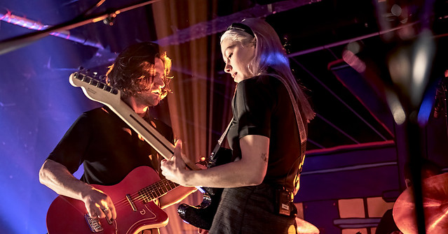 The stage, which was decked out with a backdrop of a center, as in “the Better Oblivion Community Center,” with the words, “It will only end in tears” hanging over Marshall’s drum kit. And as the set began, the various lights, lasers, and smoke cast a made for an exciting start! Beginning with “Didn’t Know What I Was in For” from the band’s self-titled LP, they went into the single, “Dylan Thomas,” as Phoebe and Conor played off each other. And when the set got to the song, “Exception to the Rule,” Phoebe and Conor each took to separate mics and sang out to the audience, sitting on the edge of the stage for a bit, while a big beach ball bounced around the room.