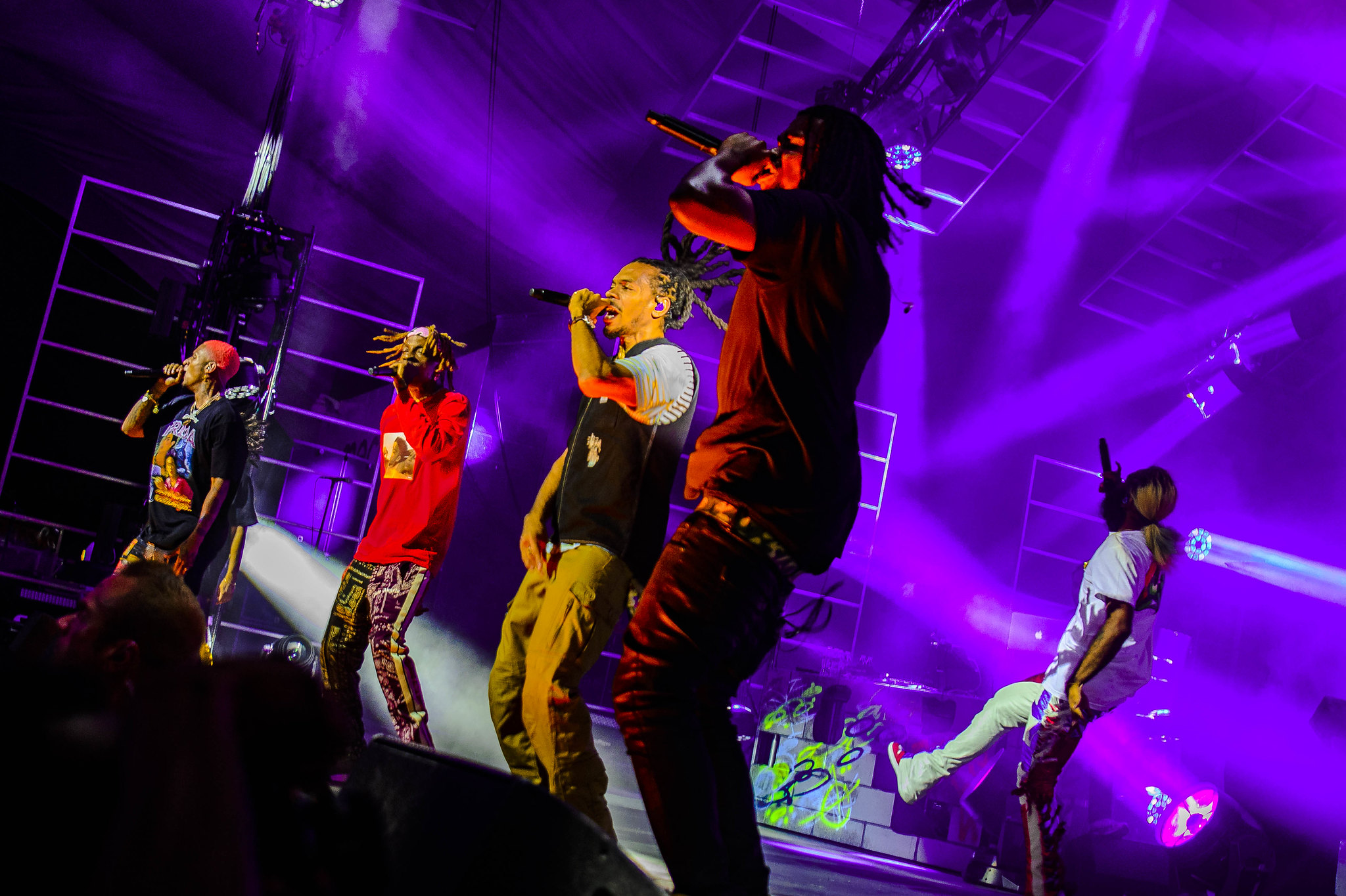 The stage clears as Joey Bada$$ took his first chance on stage performing “Paper Trails,” “Christ Conscious” and “No. 99” from his first album “B4.DA.$$” before turning it over to the Zombies. The stage goes black as the intro to “Headstone” begins and the crowd starts to chant along “Victory, Victory gold on my neck, Mr. T…” The lights come up as the guys jump off the rubble background as the song begins. All three acts traded off on stage, with the whole Coast coming together to perform track from the album like “Rubber Band,” “Distance,” and “Bones” and Zombies and Joey performing songs from different albums each time they came out. They eventually all stay onstage while hit songs like, “Palm Trees” and “Devastated” rang off.