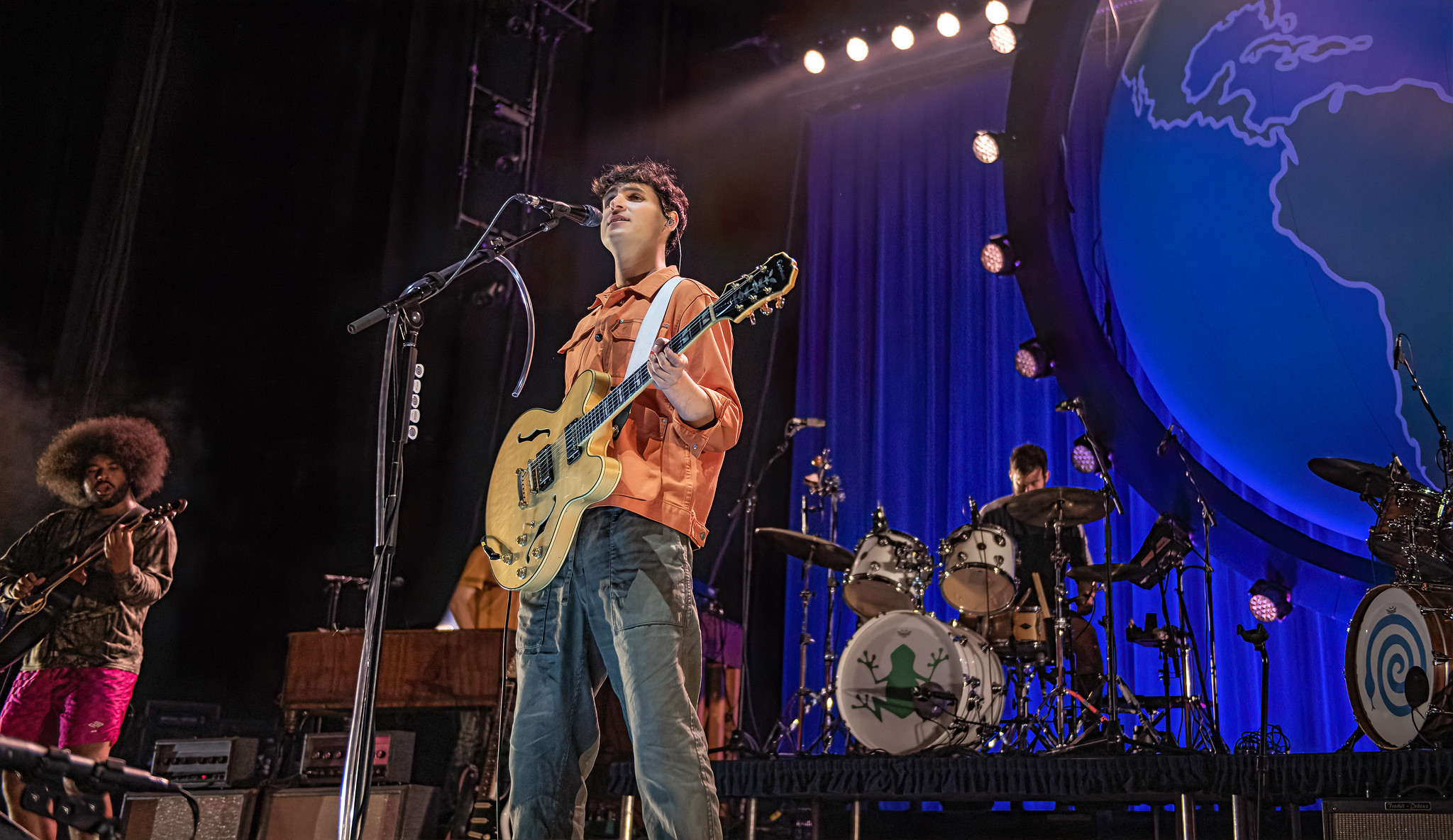 As the band took the stage in front of a huge rotating blue and green globe, it was clear this band was here to have fun. As Koenig took center stage, Jones and Baio both rocked out, playing to the audience — a kind of duel of sorts to see who could get the most reaction as the band started off the set with “Sunflower” from the new album.