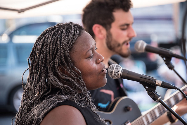 Though the late afternoon temperature on July 3 was pushing 95 degrees, the multi-cultural crowd spilled across the parking lot with folks sitting at picnic tables, on camp chairs, and in the backs of cars. Some even managed to get up and dance.