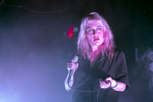 Early in their set, Boy Harsher, a duo of vocalist Jae Matthews and synthesist Gus Muller, presented “Give Me a Reason,” a song from their most recent project, this year’s soundtrack album to their film, The Runner. Left to its own devices, the song sounded 100 percent as if it could have sprung from the chart lists of eastern Europe in the very early ’80s. Jae intoned huskily over a bounding synthline, each allowing the sound plenty of room to breathe and a lot of space to mesmerize the enthralled gathering.