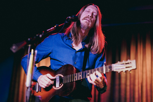 Long, lean and with his hair dangling down over either shoulder and his royal blue dress shirt, the campestral bluesman at times had the aura of a contemporary shaman. He swapped guitars along the way, using the slide on his Guild T-100D, too, and he was playful with his bandmates through the set. He shared insight into their relationship through that engagement.