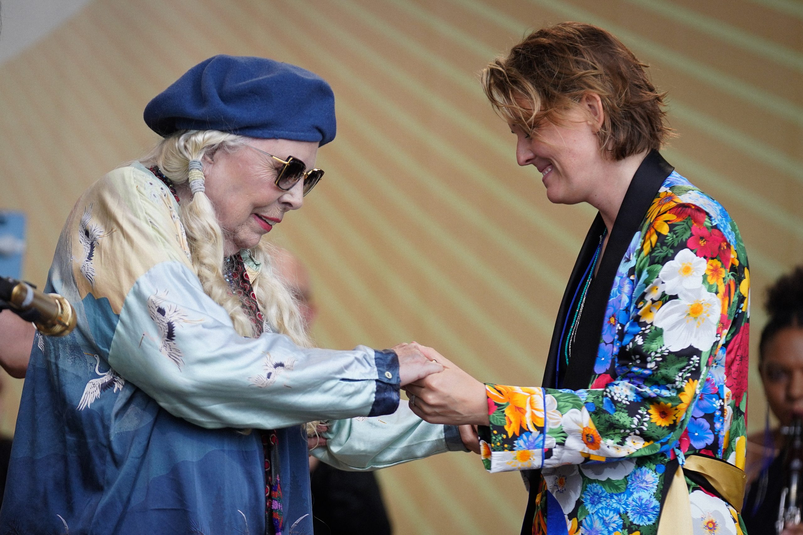 Brandi Carlile welcomes Joni Mitchell to the stage at the Newport Folk Festival on July 24, 2022, her first time back at Fort Adams since 1969. (Photo by Casey Vock)