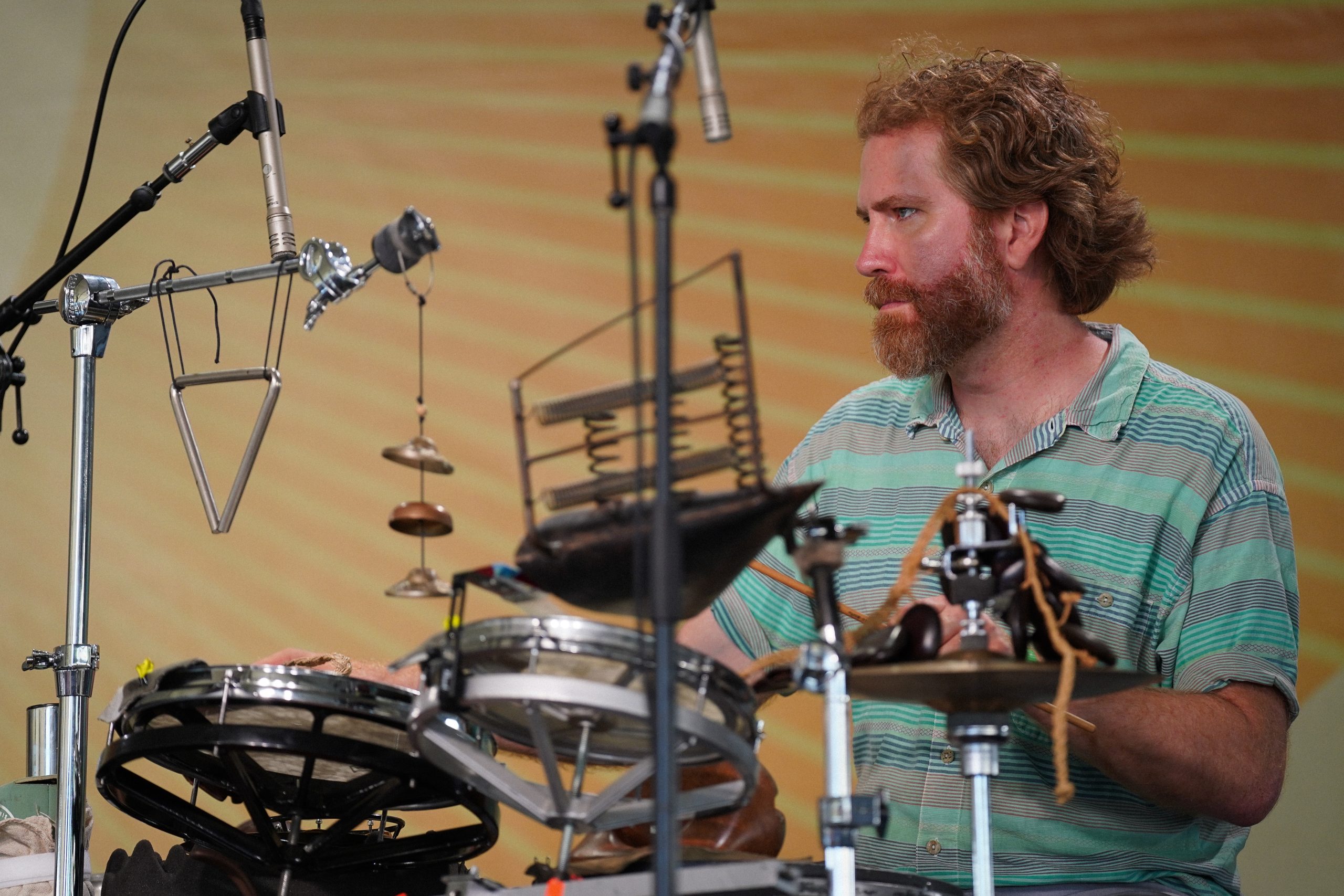 Joe Westerlund, a respected drummer from Wisconsin, was on stage with three different acts throughout the weekend, not an easy task for any musician. Joe’s a touring member of The Dead Tongues, the initial band to play on the Quad Stage Friday, the drummer for The A’s, a group that played for its first time ever on Saturday, and then on Sunday was part of the Psychic Hotline performance. Not only did it require tremendous preparation in terms of rehearsal and coordination, but Westerlund said it also took time for him to piece together the right drum and percussion setups.