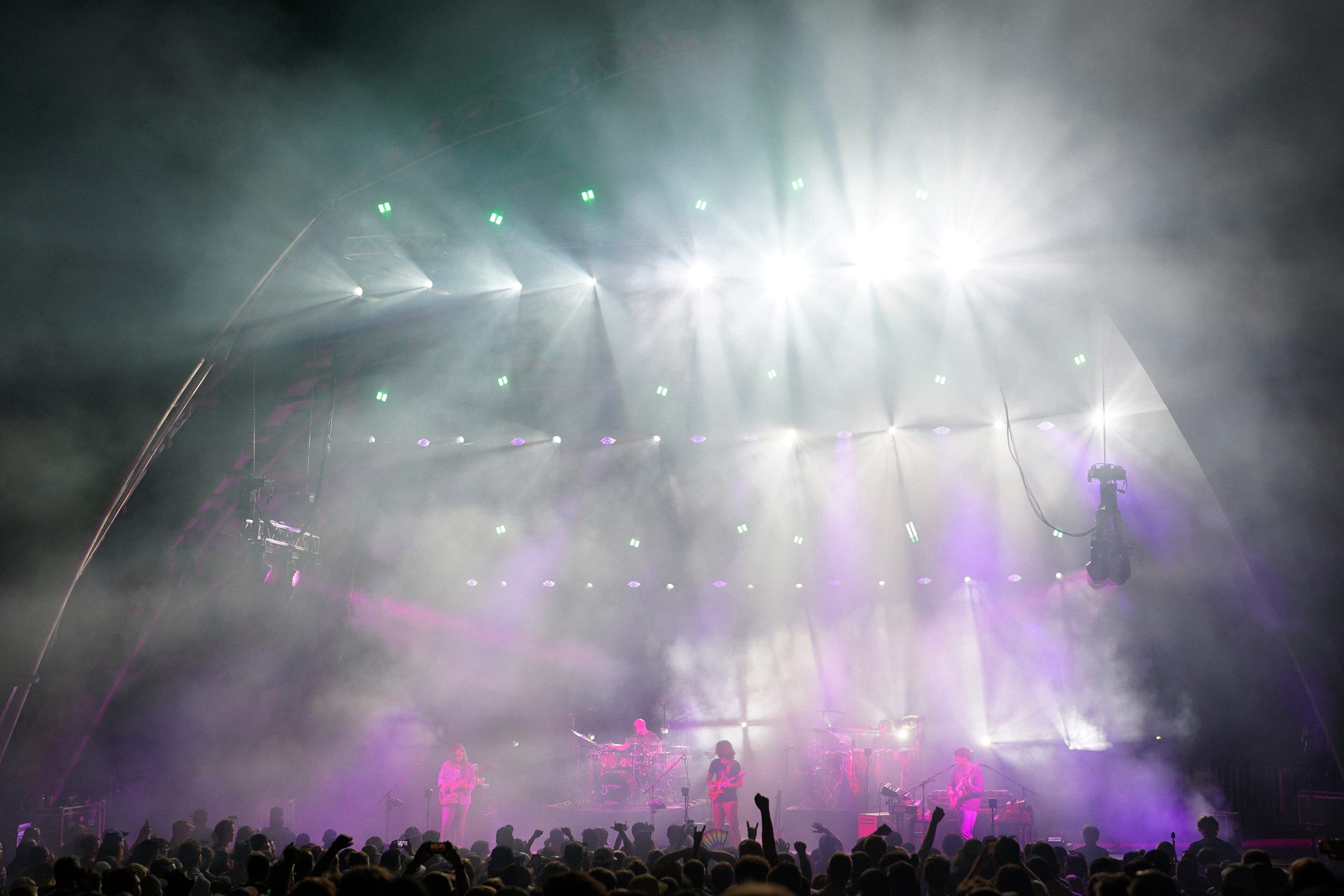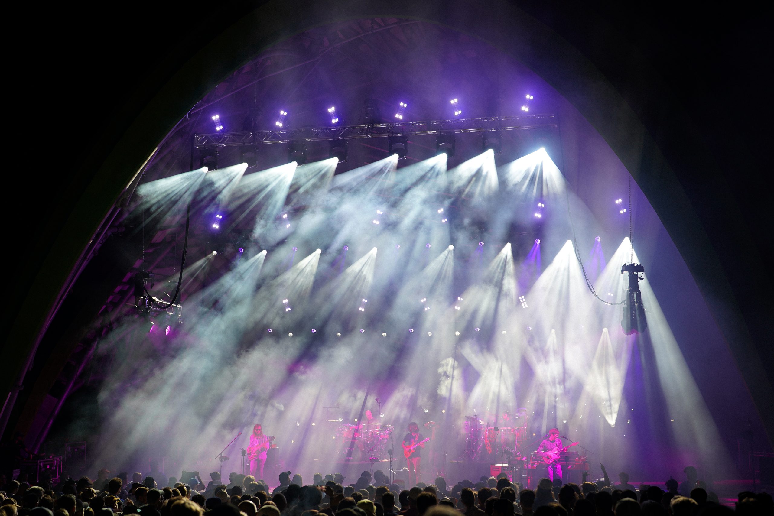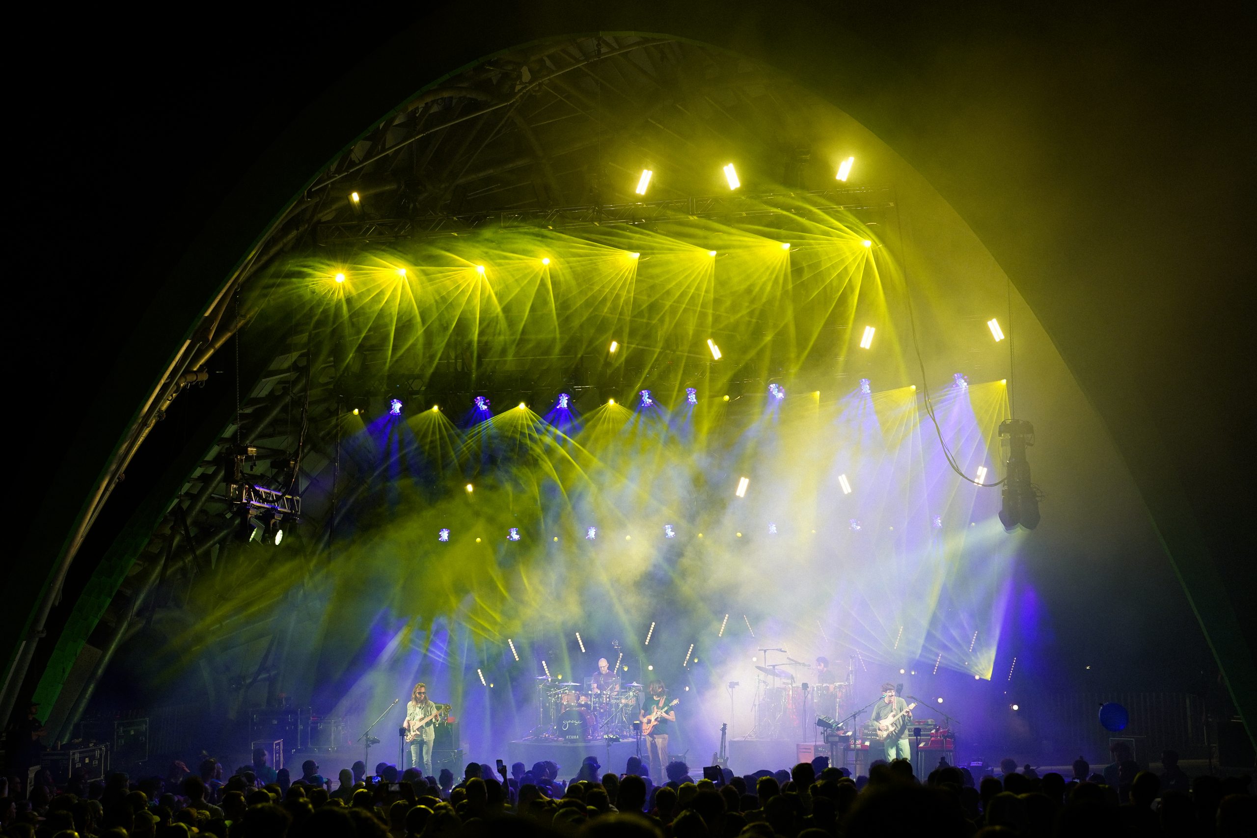But fans of all ages filled the grassy slope of the park, packed close to the 60-foot-tall, bright-green tiled construction and all the way back up underneath the massive trees as the sun was setting and the five-piece outfit from Norwalk, Connecticut, took the stage for what became a long haul of nearly three hours’ worth of music and a mind-blowing light exhibition made all the more alluring cast against the surrounding brush canopies, a just barely-waning moon overhead and planes buzzing past for landing at nearby BWI.