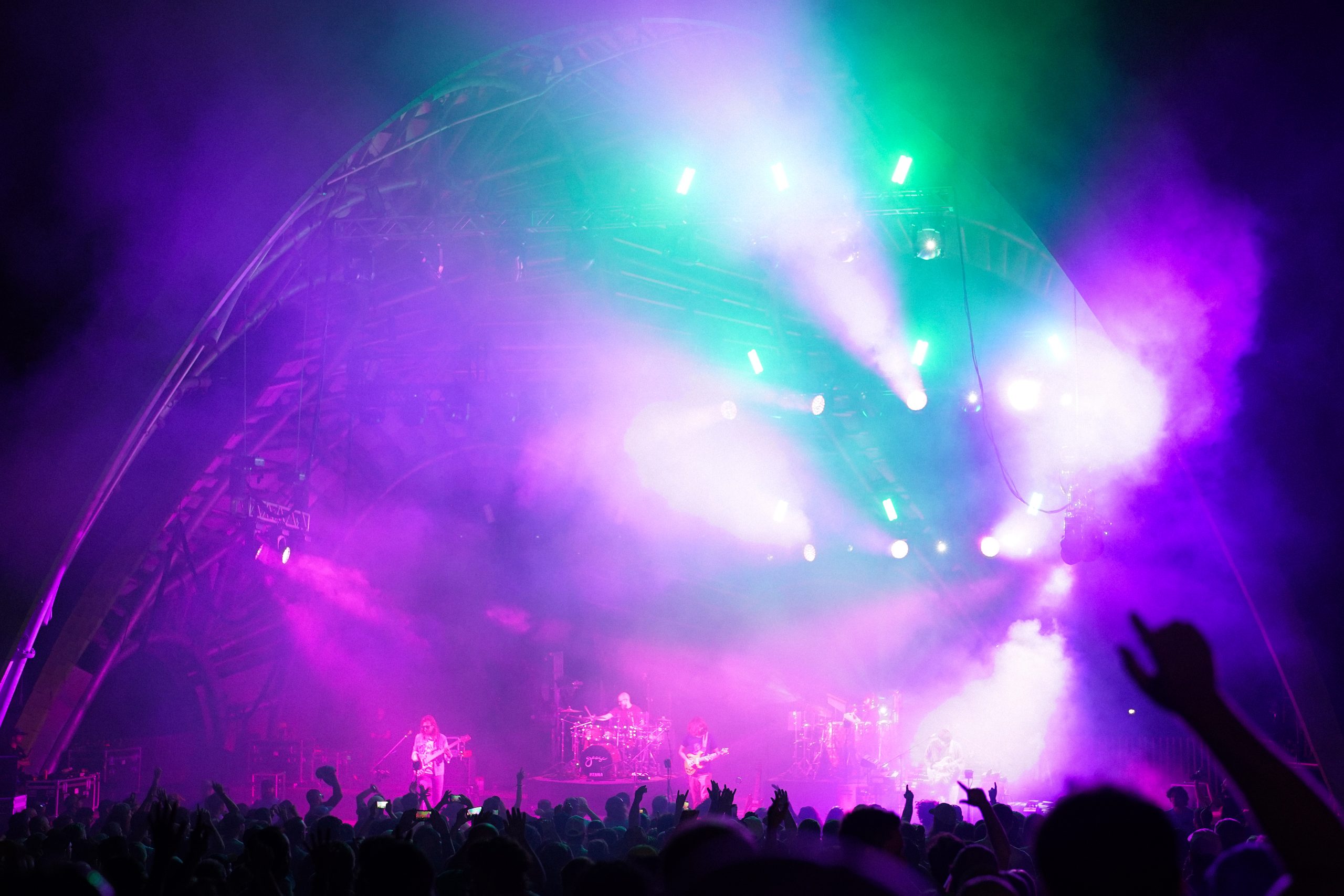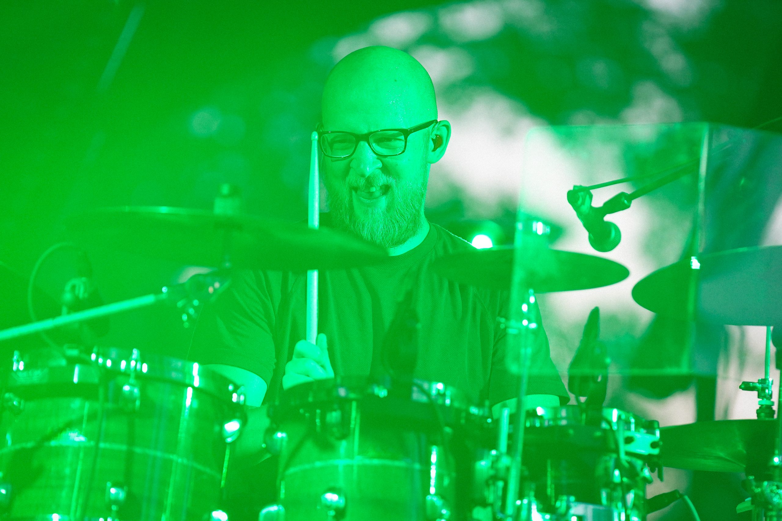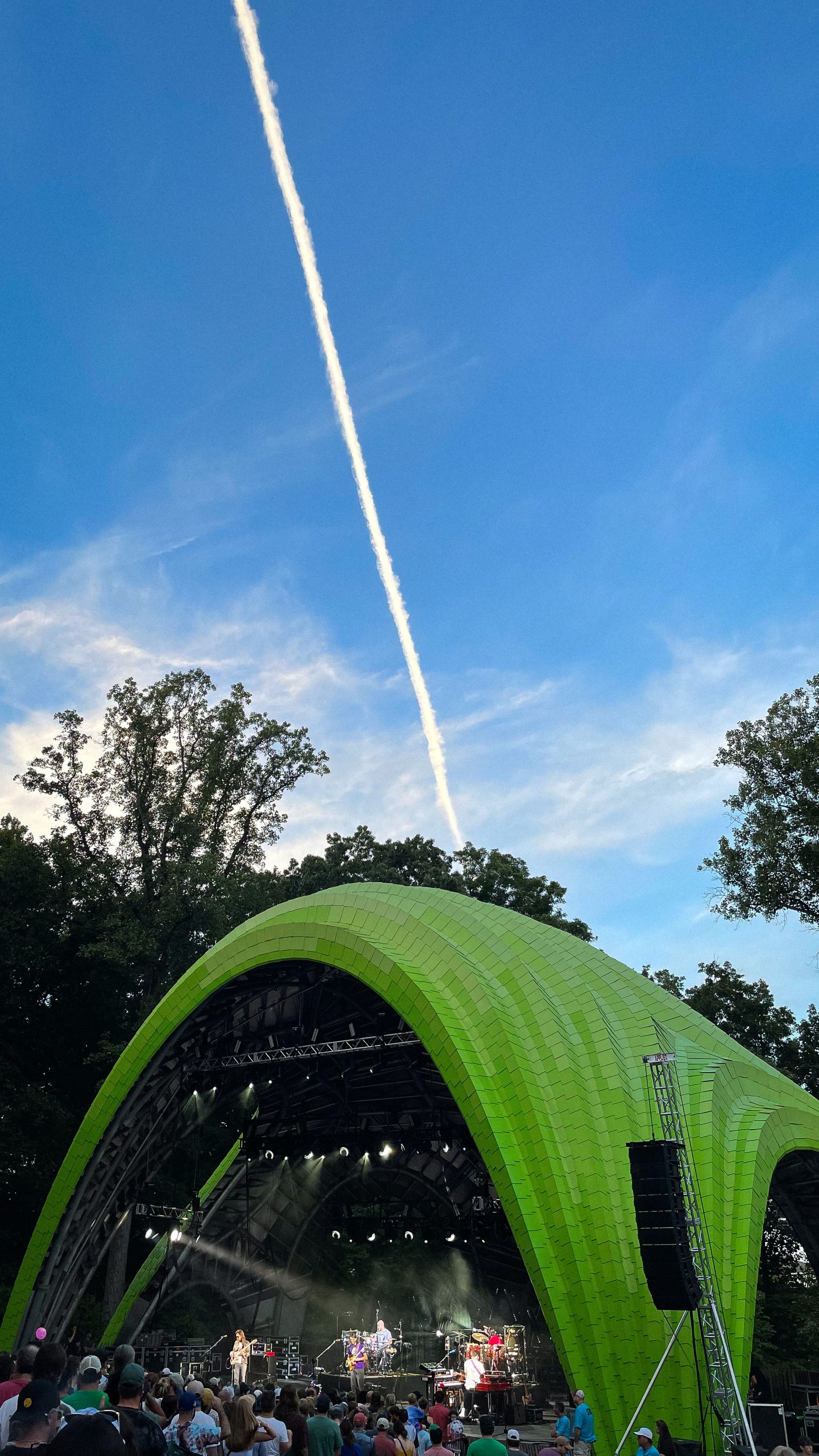 But fans of all ages filled the grassy slope of the park, packed close to the 60-foot-tall, bright-green tiled construction and all the way back up underneath the massive trees as the sun was setting and the five-piece outfit from Norwalk, Connecticut, took the stage for what became a long haul of nearly three hours’ worth of music and a mind-blowing light exhibition made all the more alluring cast against the surrounding brush canopies, a just barely-waning moon overhead and planes buzzing past for landing at nearby BWI.