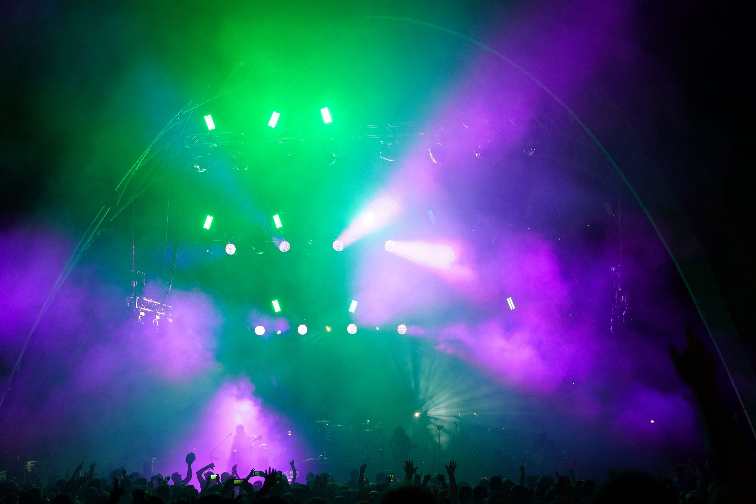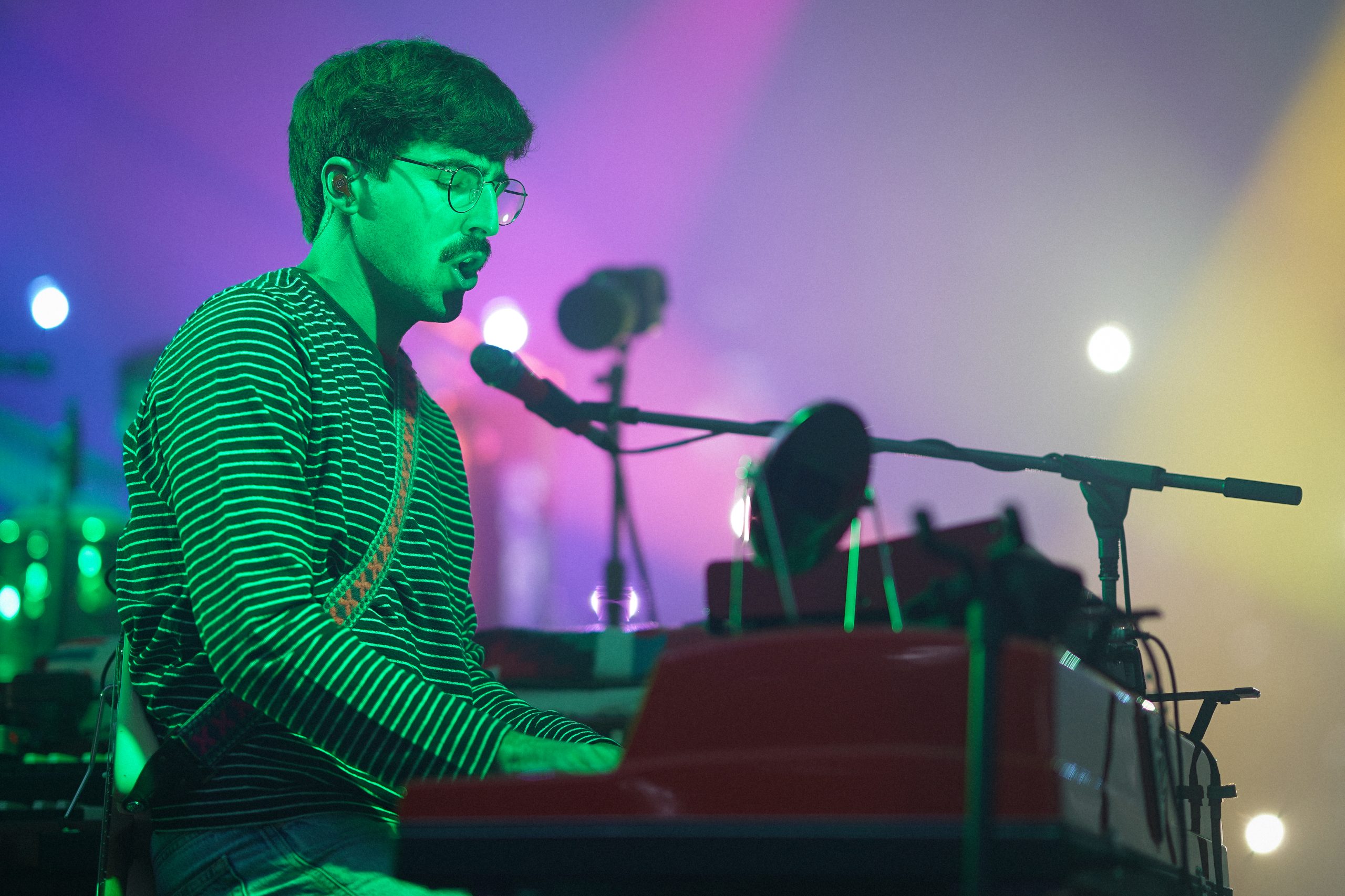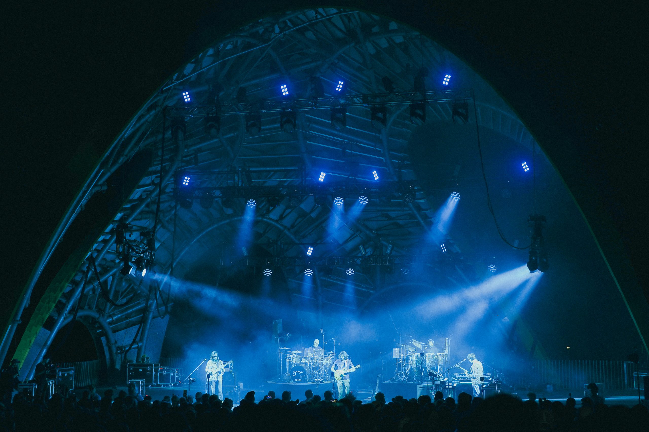 But fans of all ages filled the grassy slope of the park, packed close to the 60-foot-tall, bright-green tiled construction and all the way back up underneath the massive trees as the sun was setting and the five-piece outfit from Norwalk, Connecticut, took the stage for what became a long haul of nearly three hours’ worth of music and a mind-blowing light exhibition made all the more alluring cast against the surrounding brush canopies, a just barely-waning moon overhead and planes buzzing past for landing at nearby BWI.