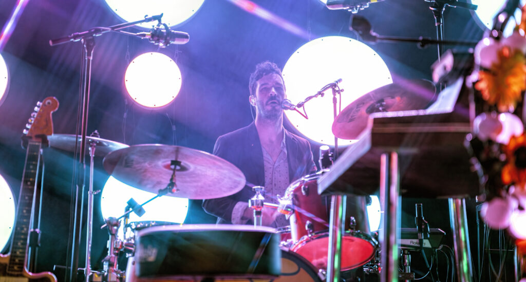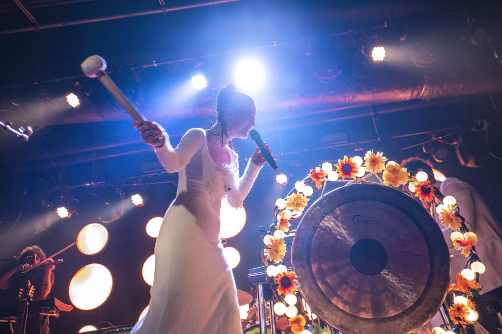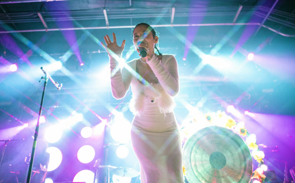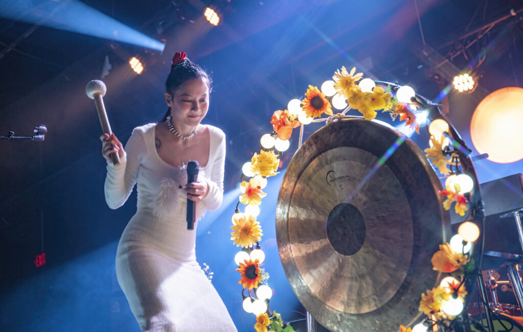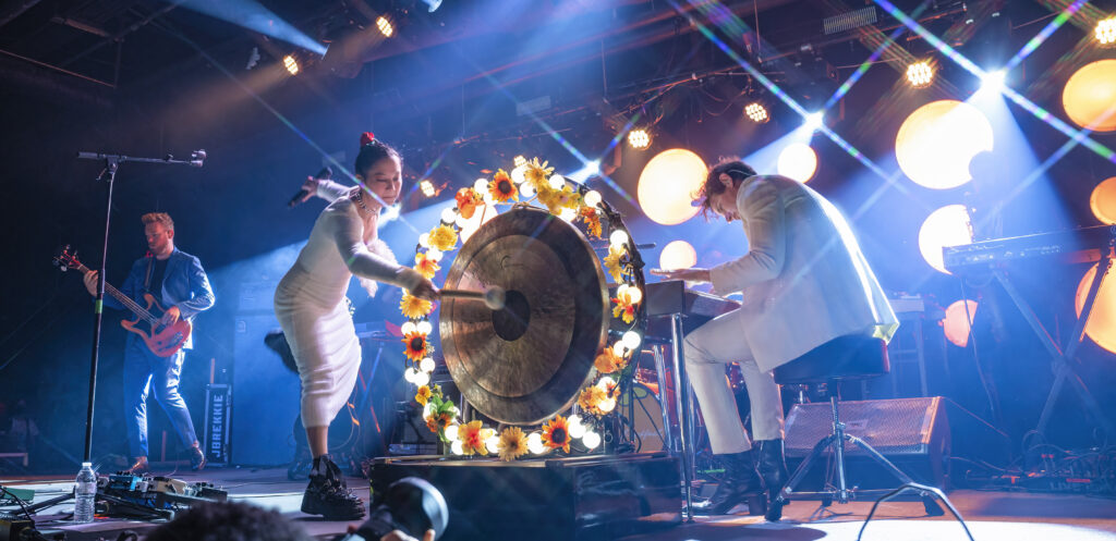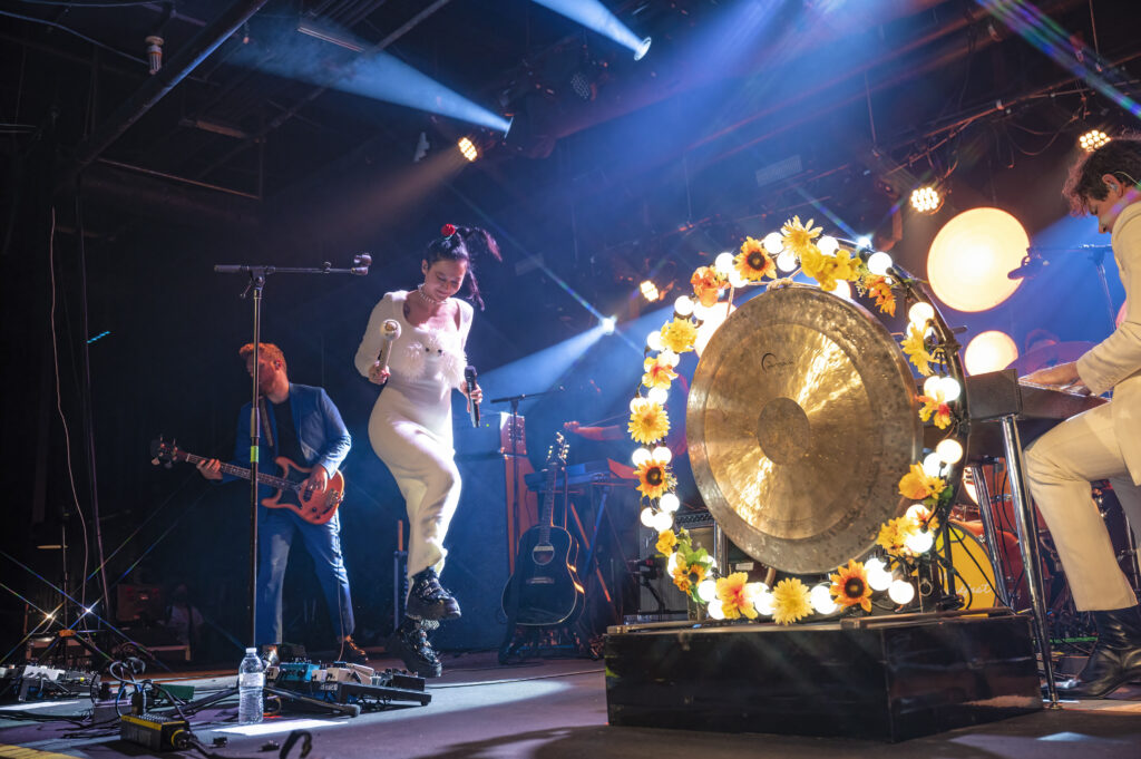 Kicking the set off in style, the band took the stage to the opening keyboard wash of “Paprika” as Michelle, mallet in one hand and mic in the other, danced and punctuated the song — banging the gong set up at the center of the stage. At times it felt like she was floating, being lifted up by some unseen force, visibly happy and feeding off the excitement in the room. And that energy continued onto the next song, the single, “Be Sweet,” as what seemed like everyone in the crowd sang along, dancing as much as they could dance in the jam-packed space.