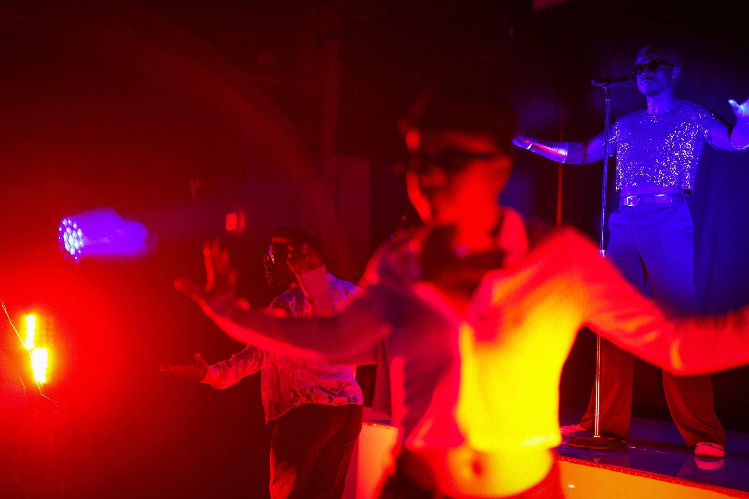 To their left, offstage, was Channel’s DJ, twisting and turning dials like the man behind the curtain. Behind the dancers sat a raised platform, where the night’s ringmaster — spectacularly stylish in a bedazzled purple cutoff, business slacks and long white satin gloves — stepped up to send the crowd into a frenzy and to begin the music in earnest.