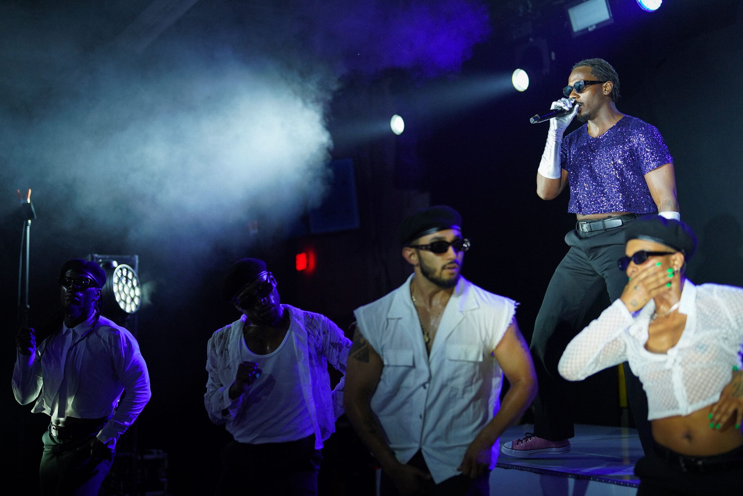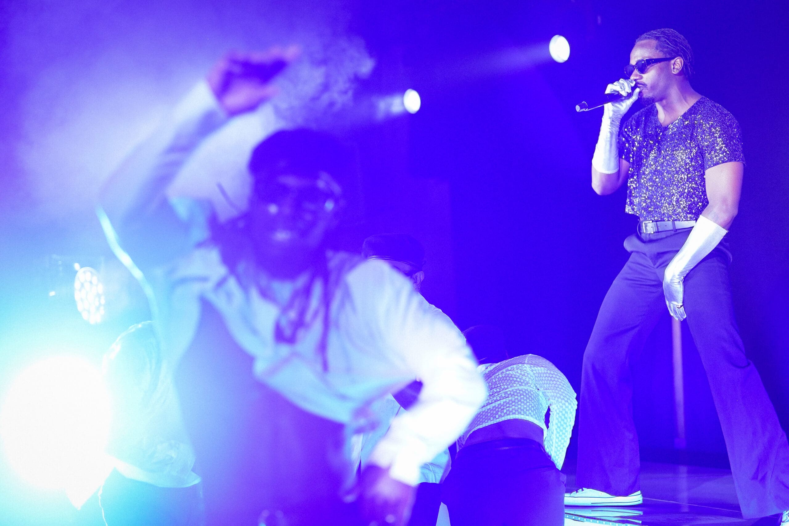 The undecorated space filled up with eager listeners who grooved in place, calling aloud with anticipation as neon blue and red lights glowed from any direction and the speakers thumped. Eventually, out of the darkness strutted Channel Tres’ four-person professional dance squad — Jessie Hollie, Chris Castillo, Sasha Mallory, and the artist named Nique27 — and they took formation across the stage.