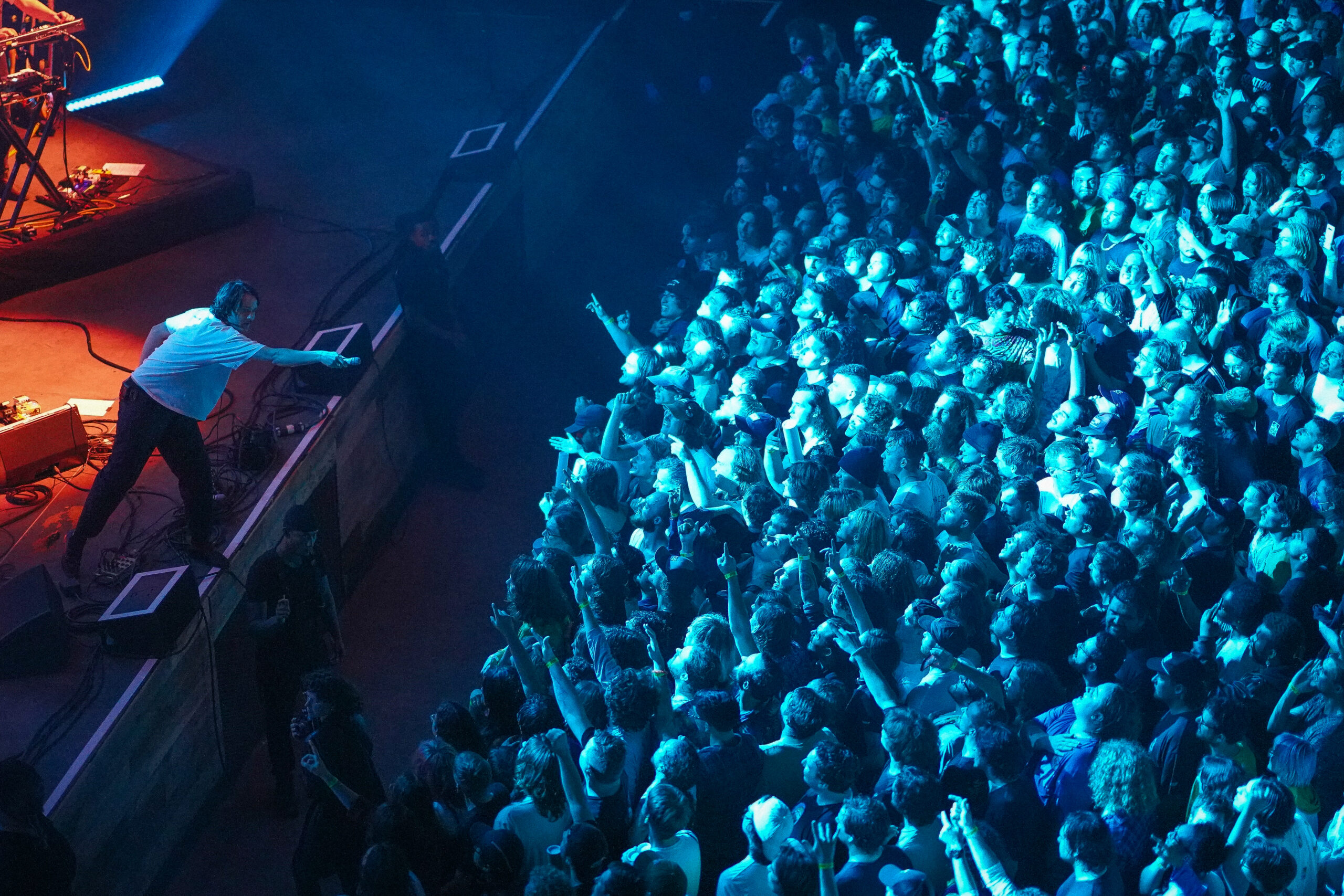 The visual projection and stage lighting, like something from a dragon’s dream, was saturated in greens, reds and oranges, and it flickered, essentially mutating the crowd — random humans rolling, arms and legs flailing in the air — into a giant slithering creature of its own, particularly when viewed from above.