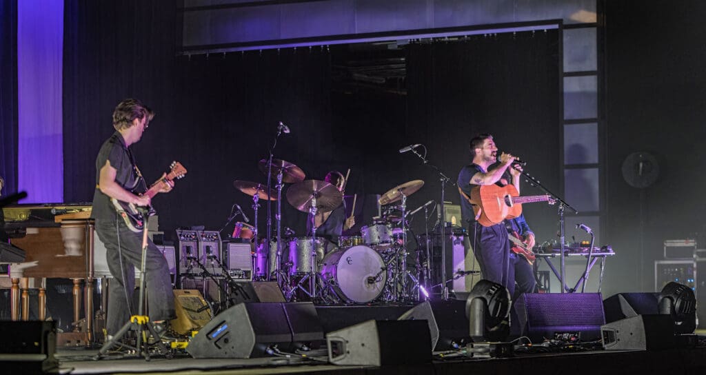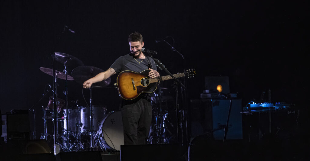 As he announced the arrival of his backing band, Mumford began on the lead song from (self-titled), “Cannibal,” as he finger-picked the chords that were punctuated by that quietly powerful voice before the band kicked in on the cresting tail of the song with an explosion of sound, Mumford’s voice riding atop the cacophonous wave. The band followed up with “Grace,” which felt more in the vein of traditional Americana-tinged songs of Mumford & Sons but with the heft of heavy guitars and massive drum sounds, served up by Dawes drummer Griffin Goldsmith.
