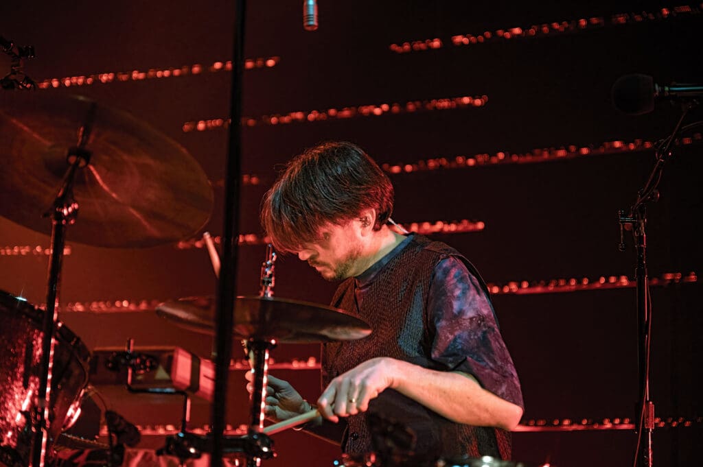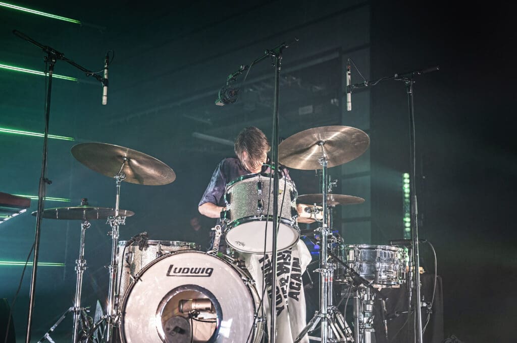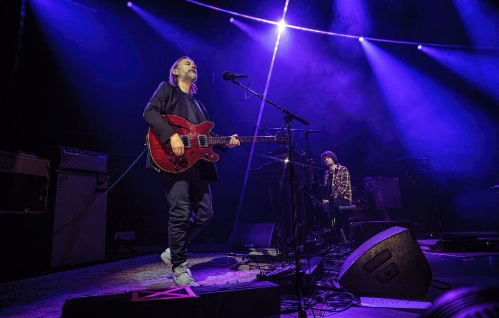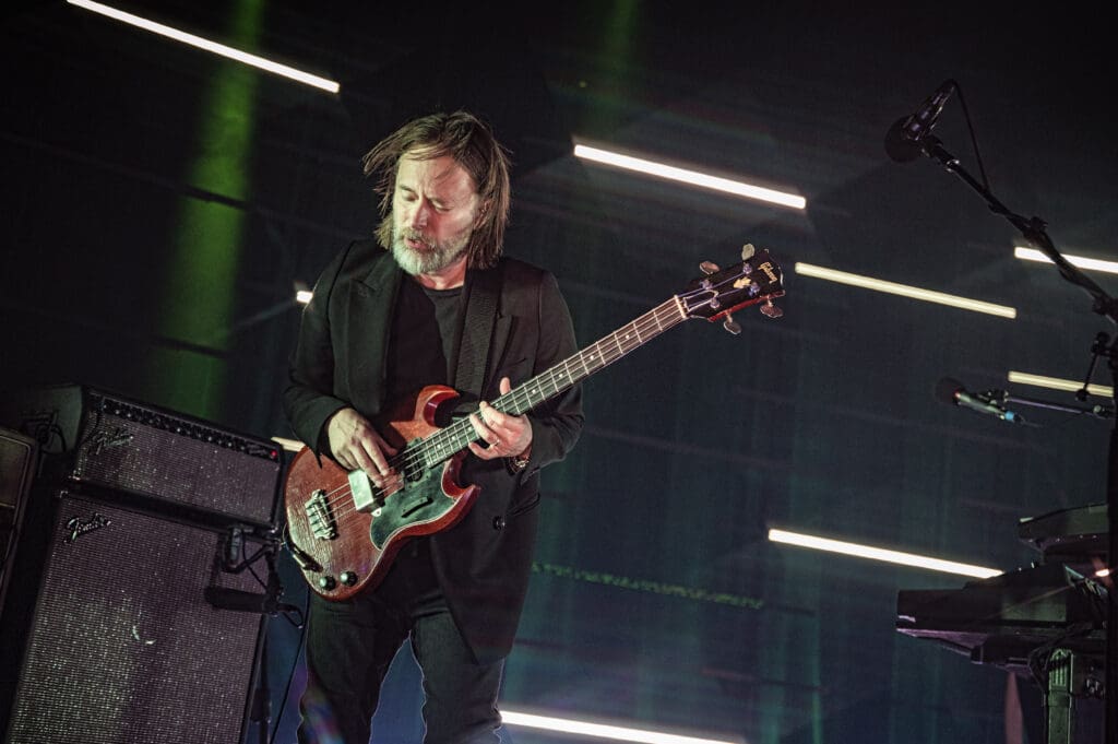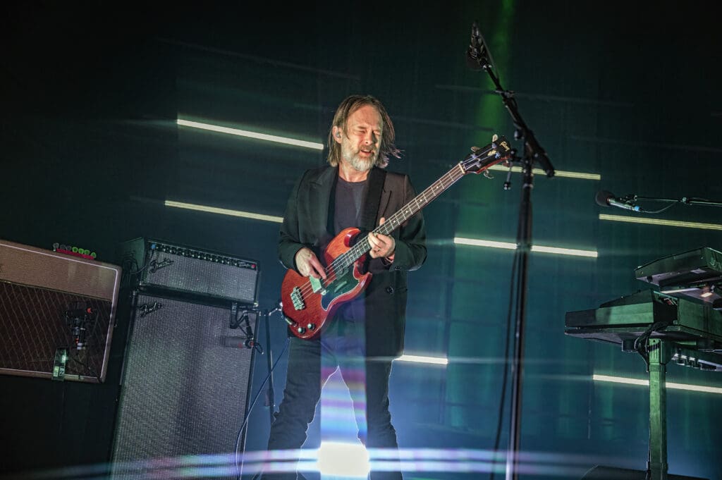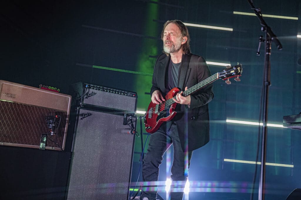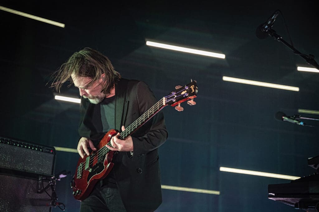 The Smile, like the projects each band member has been in before, have songs that are like their own ecosystem — confined to a degree in their own pop song structure but complex and surprising at times. Some of my favorite tracks on the album (of which there are many) go from punk-styled thumping to songs like “Free in the Knowledge,” with its ambient washes and acoustic guitar. As the band started on the song Jonny took to the piano as Thom strummed “we won’t get caught like that…” It was one of the highlights of the evening (also of which there were many) with a conventional 4/4 arrangement but with a melody that sticks in your head without a hope of leaving any time soon.