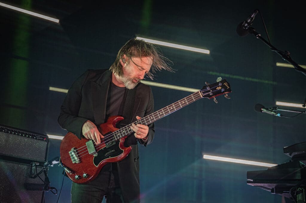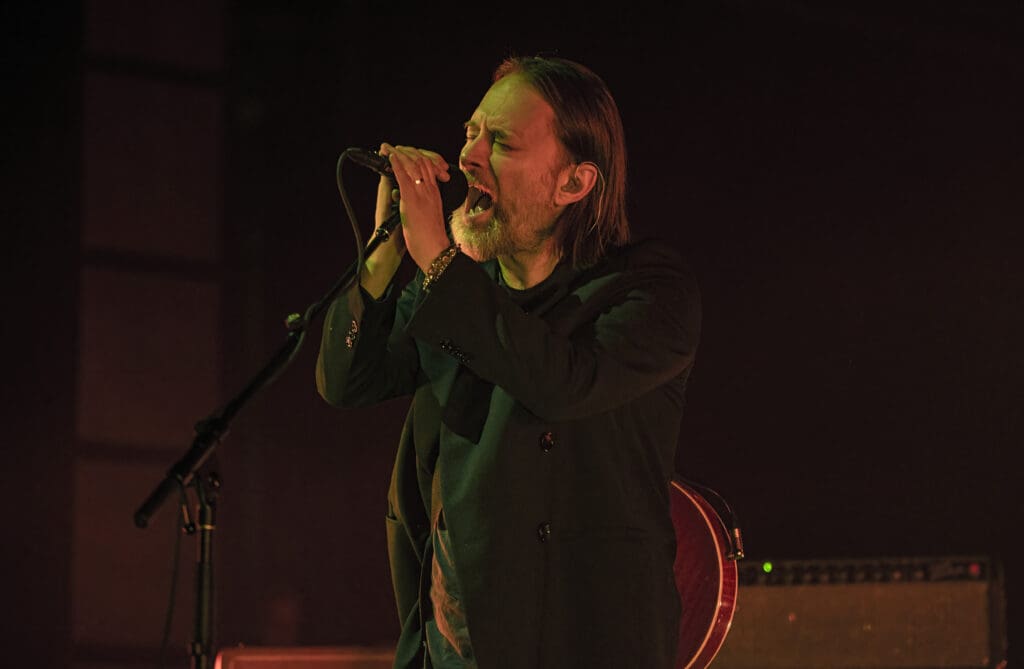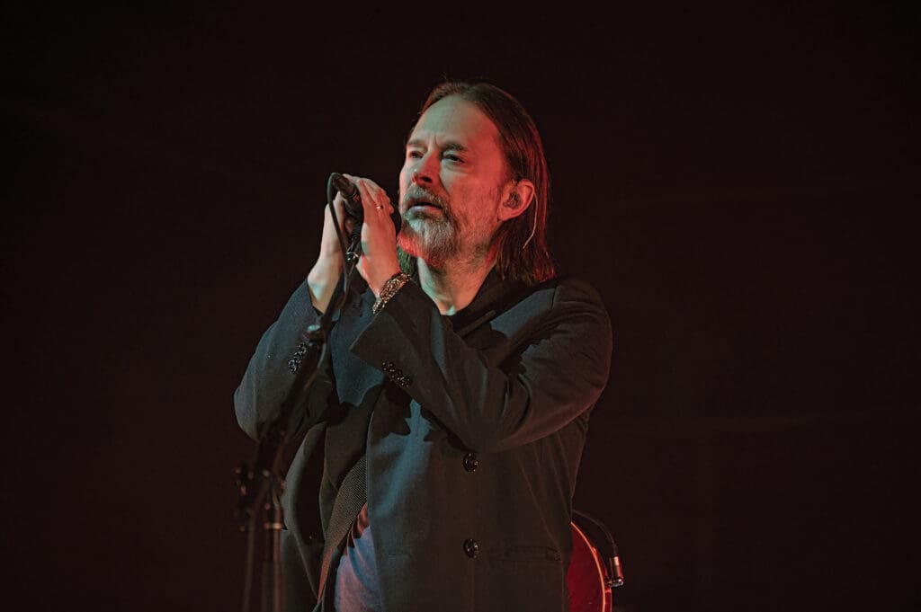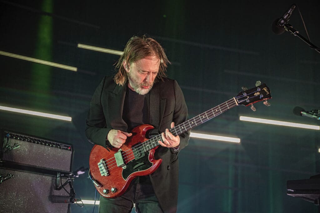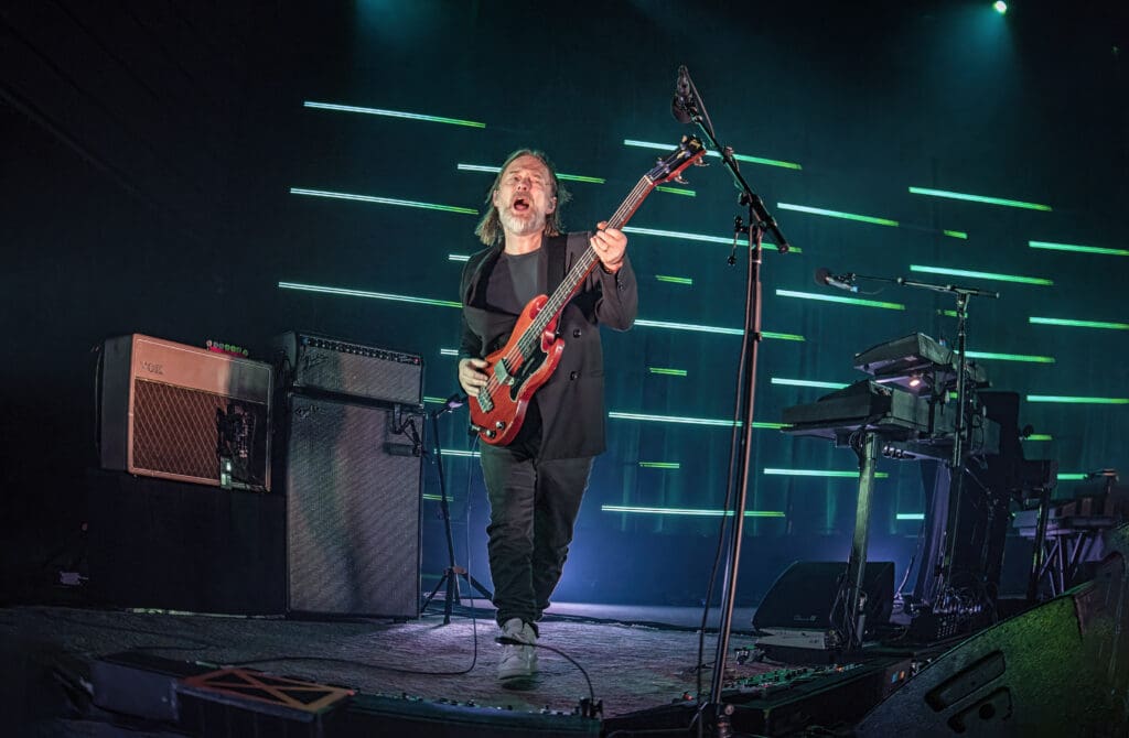 Speaking of stage lighting and set up, it was incredible as the red light of the next song, “Thin Thing,” changed in a burst of stroke into a frenetic blast as Jonny thrashed about, playing off the off-kilter beats of Tom Skinner just to turn on a dime as Thom sang “Our echo doesn’t hear us / Anymore / Hanging on a cloth edge / By its fingers” just to jump right back into the fray as the lights flashed to the manic rhythm.