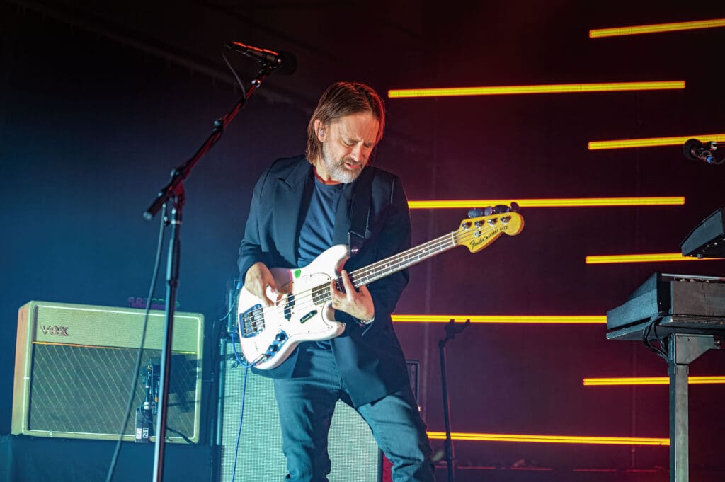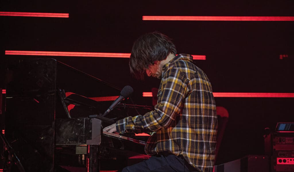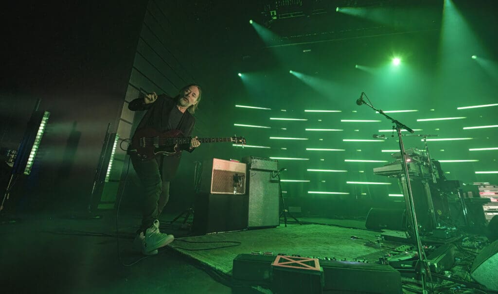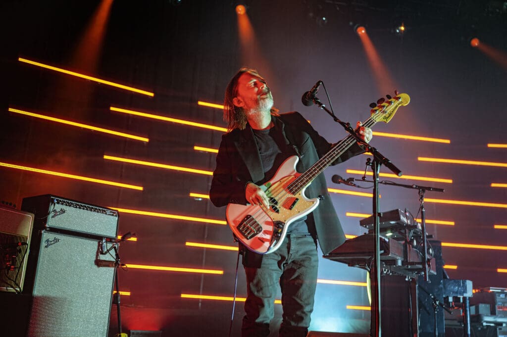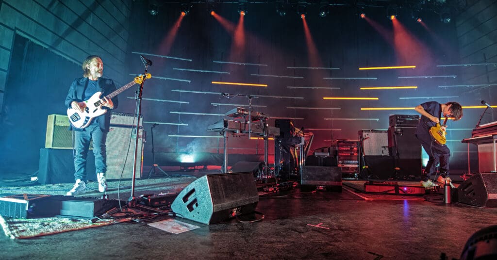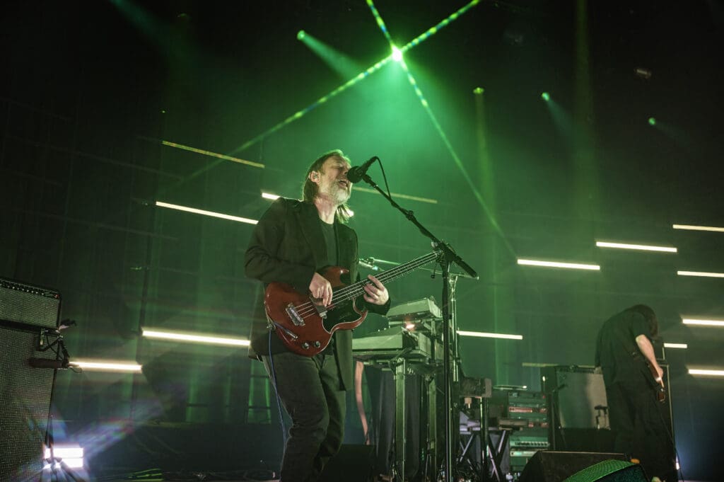As The Smile took the stage, the band started with the syncopated rhythm of “The Same” as Jonny played piano while Tom manned the keys and Thom took to the mic, guitar at his back. “We are all the same… Please!,” Thom sang as the curved backdrop of lighted bars flashed and pulsed on the stage.