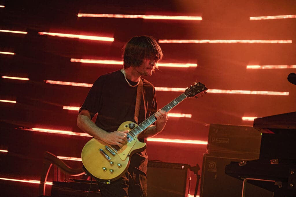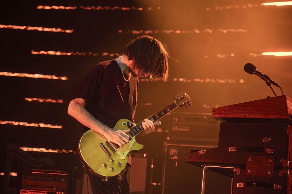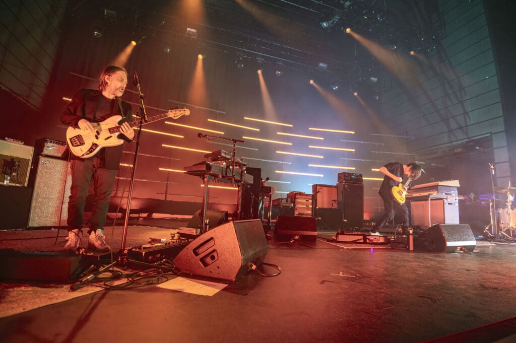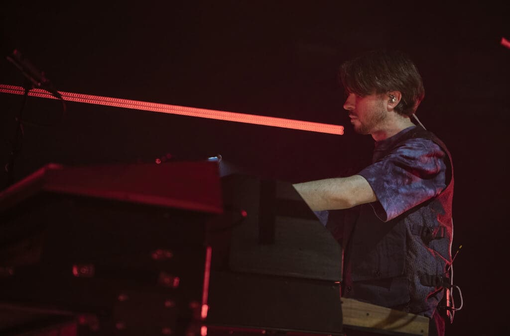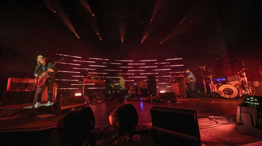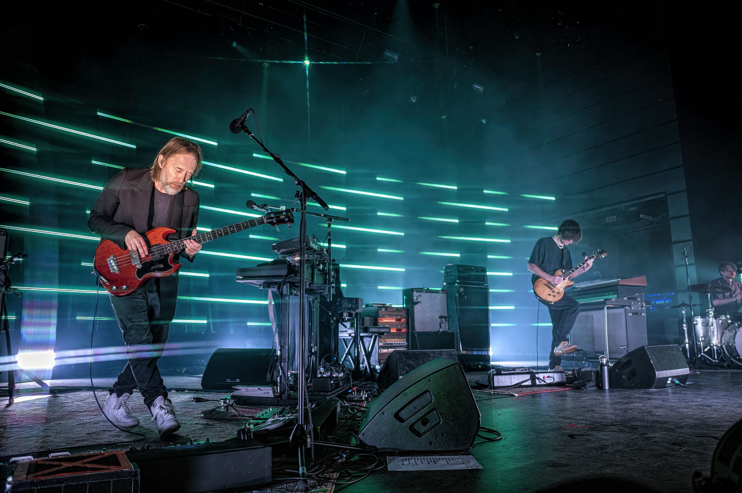 As The Smile took the stage, the band started with the syncopated rhythm of “The Same” as Jonny played piano while Tom manned the keys and Thom took to the mic, guitar at his back. “We are all the same… Please!,” Thom sang as the curved backdrop of lighted bars flashed and pulsed on the stage.