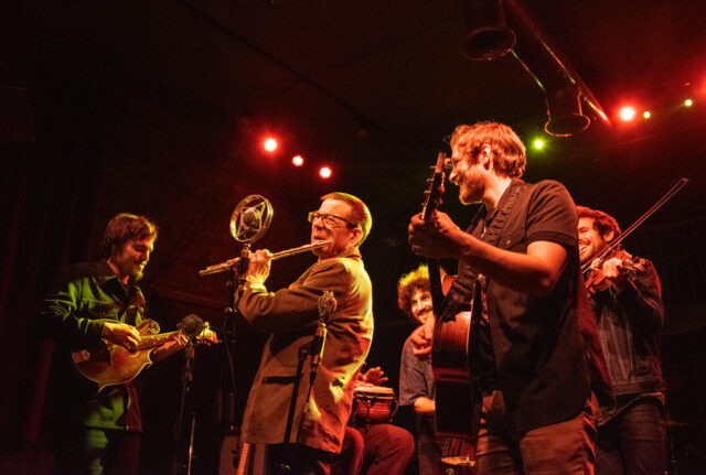 After a plea for the audience to tone down the chatter, the band gathered at the front of the stage around the Ear Trumpet and launched into the first acoustic set with “Been All Around This World.” We then got a wonderful treat as Matt Eakle from the David Grisman Quintet joined the band onstage to add flute for the rest of the set. A song I’d been hoping to hear, “Thrill is Gone,” featured percussionist Chris J. English on vocals.