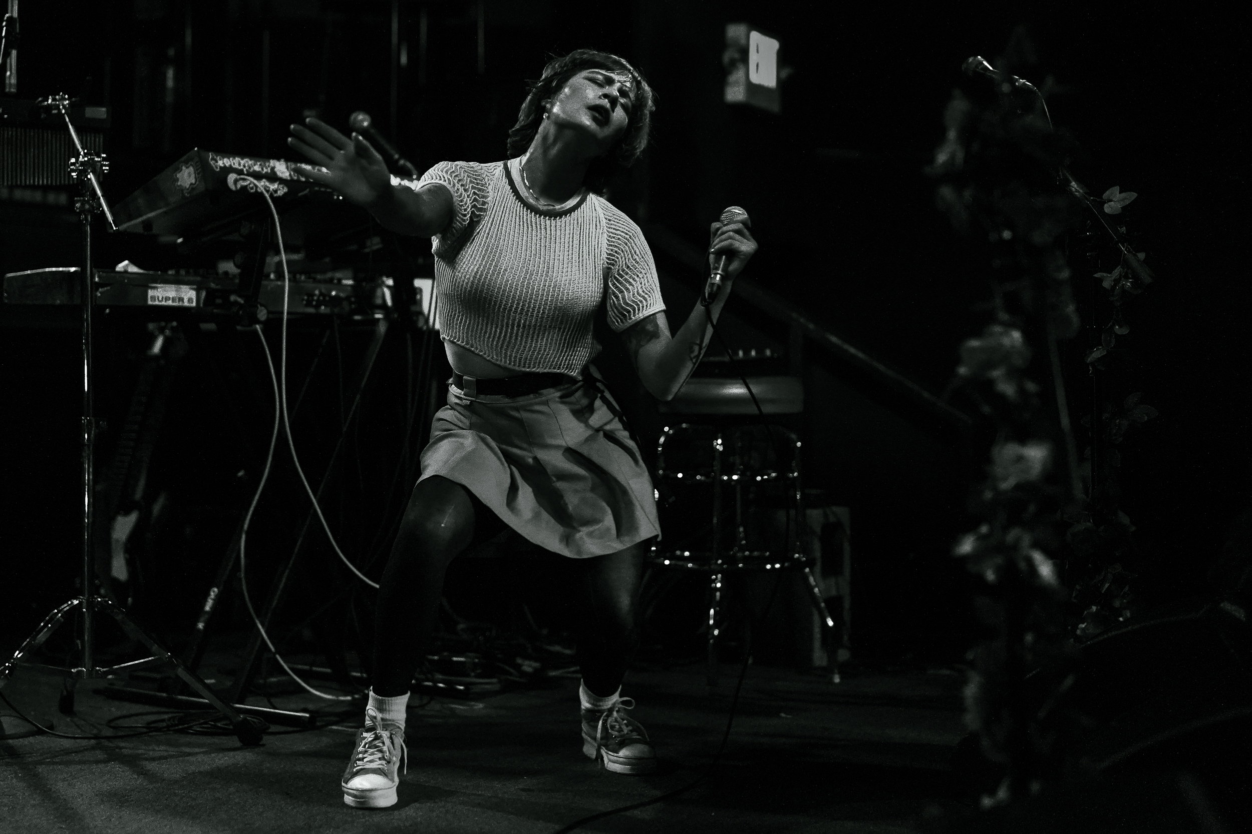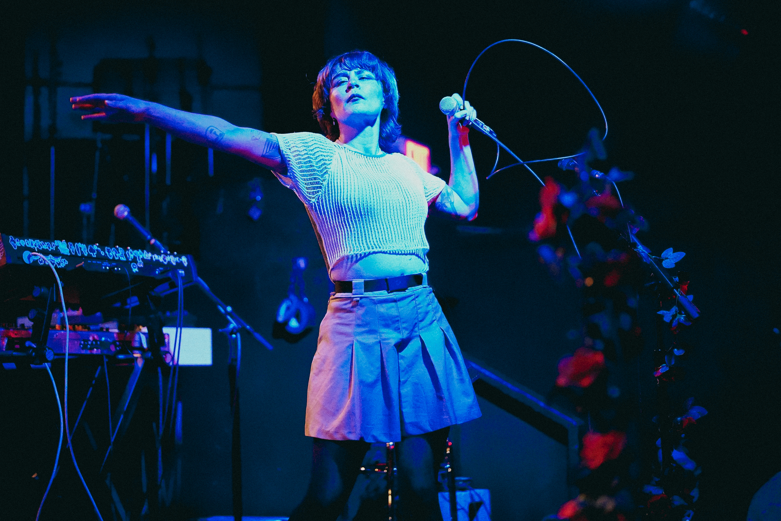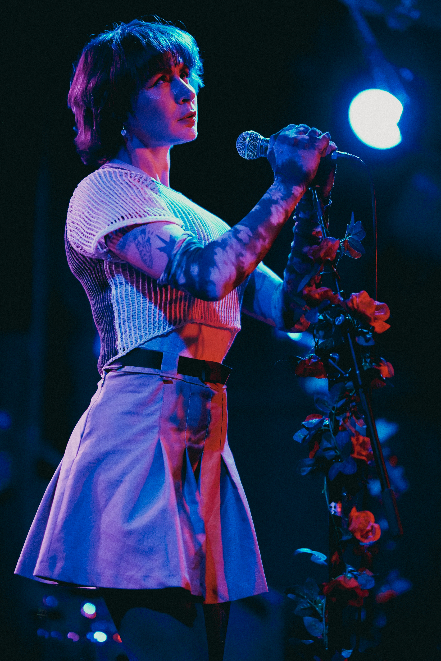 Before anyone could speculate for too long, New York City-based Avant-pop poet and vocalist Mary Jane Dunphe offered a bold and evocative opening set, an emotional freefall, crimson in color thanks to the mood lighting and the massive heart-shaped rose arrangement on the back wall that, along with roses affixed to mic stands on fixtures throughout the building, set the scene for the residency.