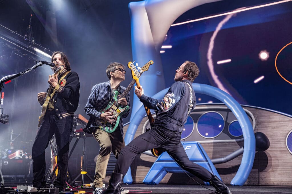 But this was the rock show that fans craved. Heavy on the hits, with a good deal pulled from their first two albums — Weezer (Blue Album) and Pinkerton. Cuomo and company tend to write hook-heavy songs, and those earworms were in full effect. From “El Scorcho” to the sly transition from Cuomo’s “Blast Off!” into “Undone (The Sweater Song),” the band had a lot of fun as Cuomo stumbled up to the top of the raised platform above the stage as it sloped over the giant stage steering wheel.
