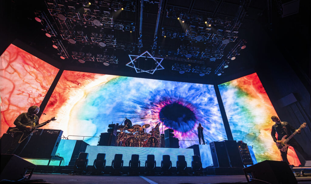 Boom ba-boom, boom ba-boom came the intro before chimes from Danny Carey signaled the start of the set and the first song, “Fear Inoculum.” Carey was soon joined by Adam Jones on guitar on one side and bassist, Justin Chancellor, on the other side as they slinking rhythm propelled the song. Appearing on a riser next to the drum riser, Maynard James Keenan sang silhouetted by the enormous visual display that filled the entire stage and beyond.