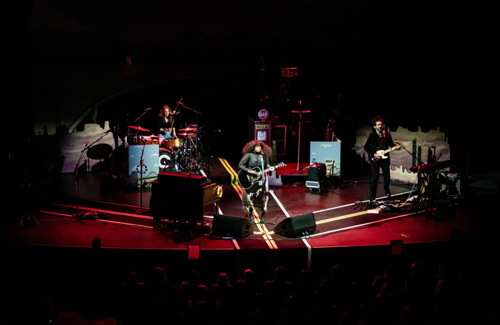 Burning a palo santo (as a purification ritual), Ms. Potter and band (Ricky Dover, Jr.: guitars; Indya Bratton: guitar, keys; Kurtis Keber: bass; Jordan West: drums) hit the stage and over the next two hours took us on a musical road trip. The stage, festooned with glowing cacti, neon road signs, and a huge western themed backdrop, reflected Potter’s recent cross-country journeys upon which Mother Road (Fantasy Records) is based.