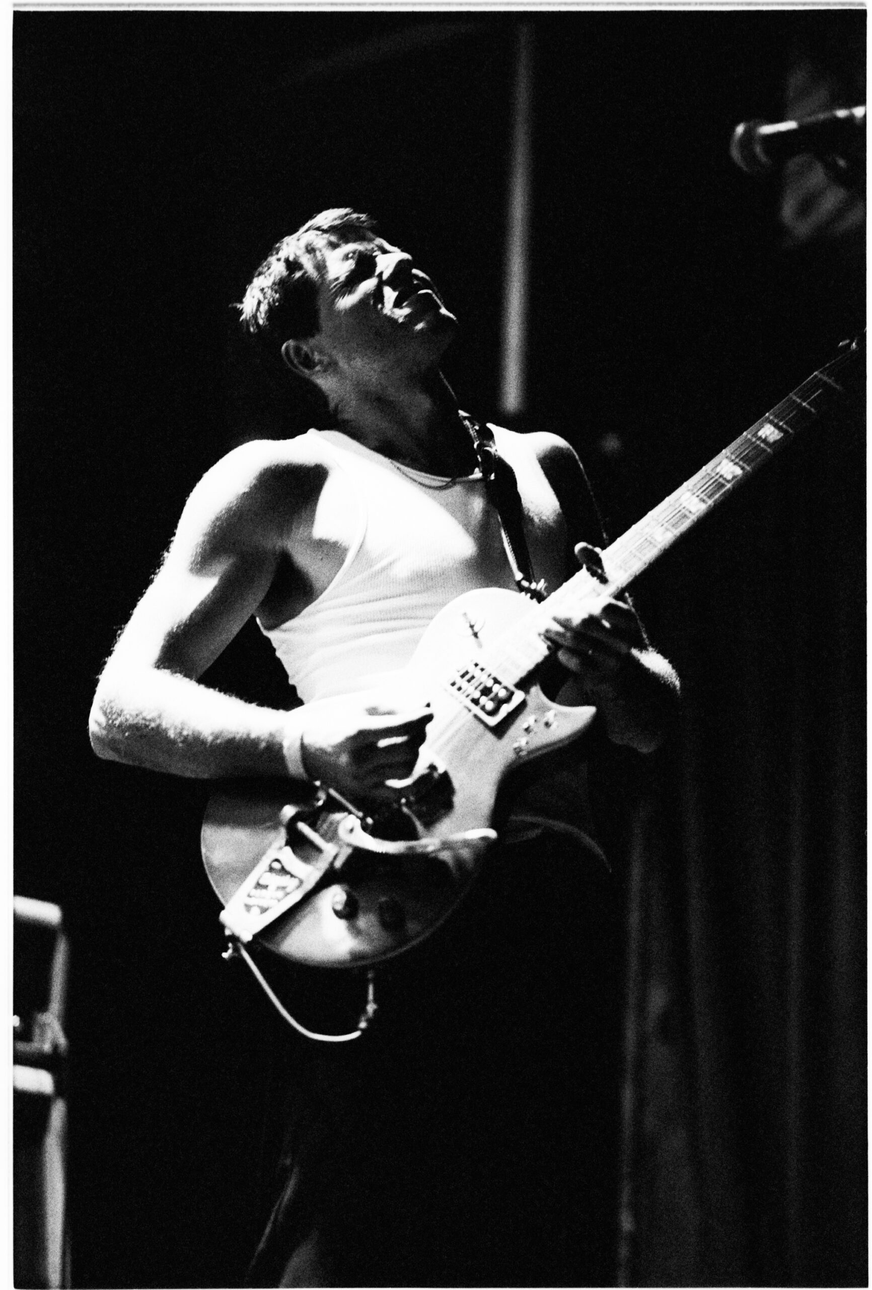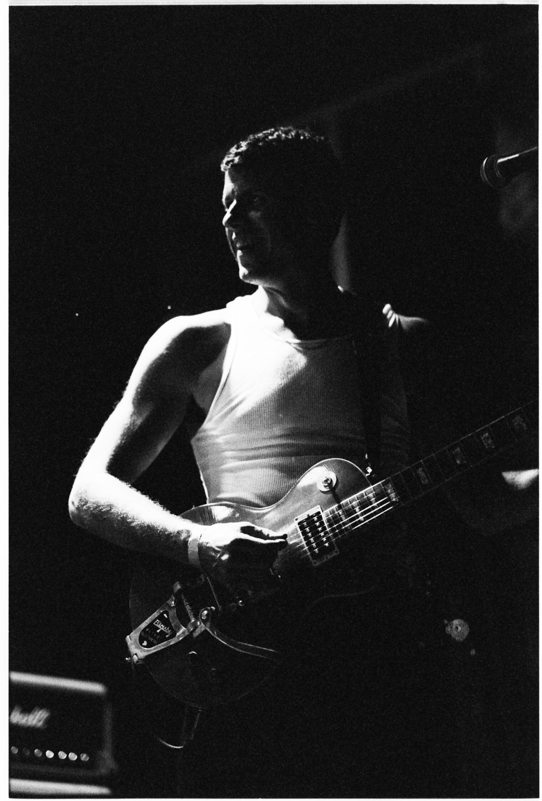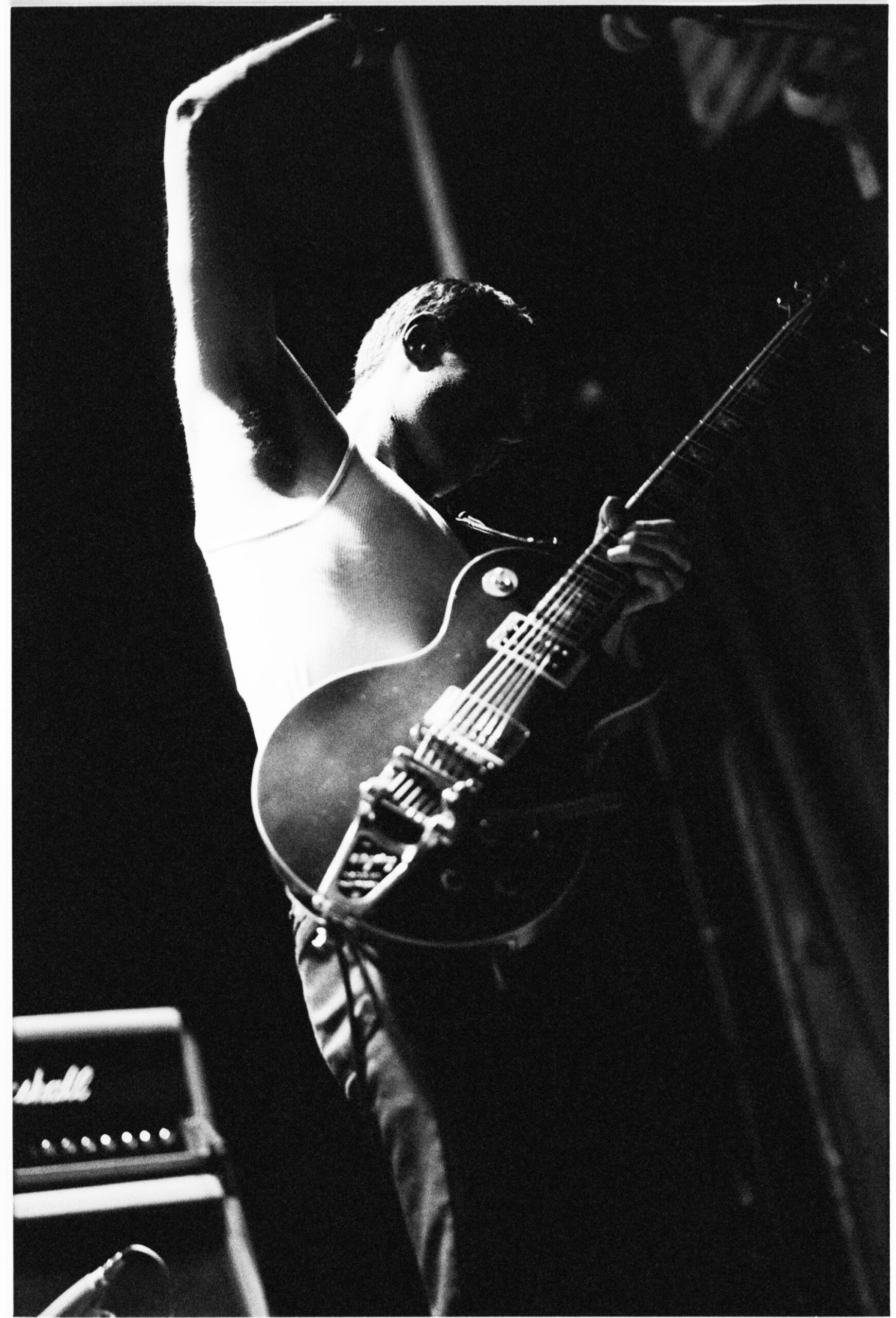 All night, he played in motion — standing up high on his toes, tossing up his right arm, hopping, falling to his knees, headbanging, and leaning back to soak the wee bit of light in the place. He drew tremendous sound from the set of Marshall amps behind him, and by the fourth or fifth song, he was down to his undershirt and dripping with sweat.