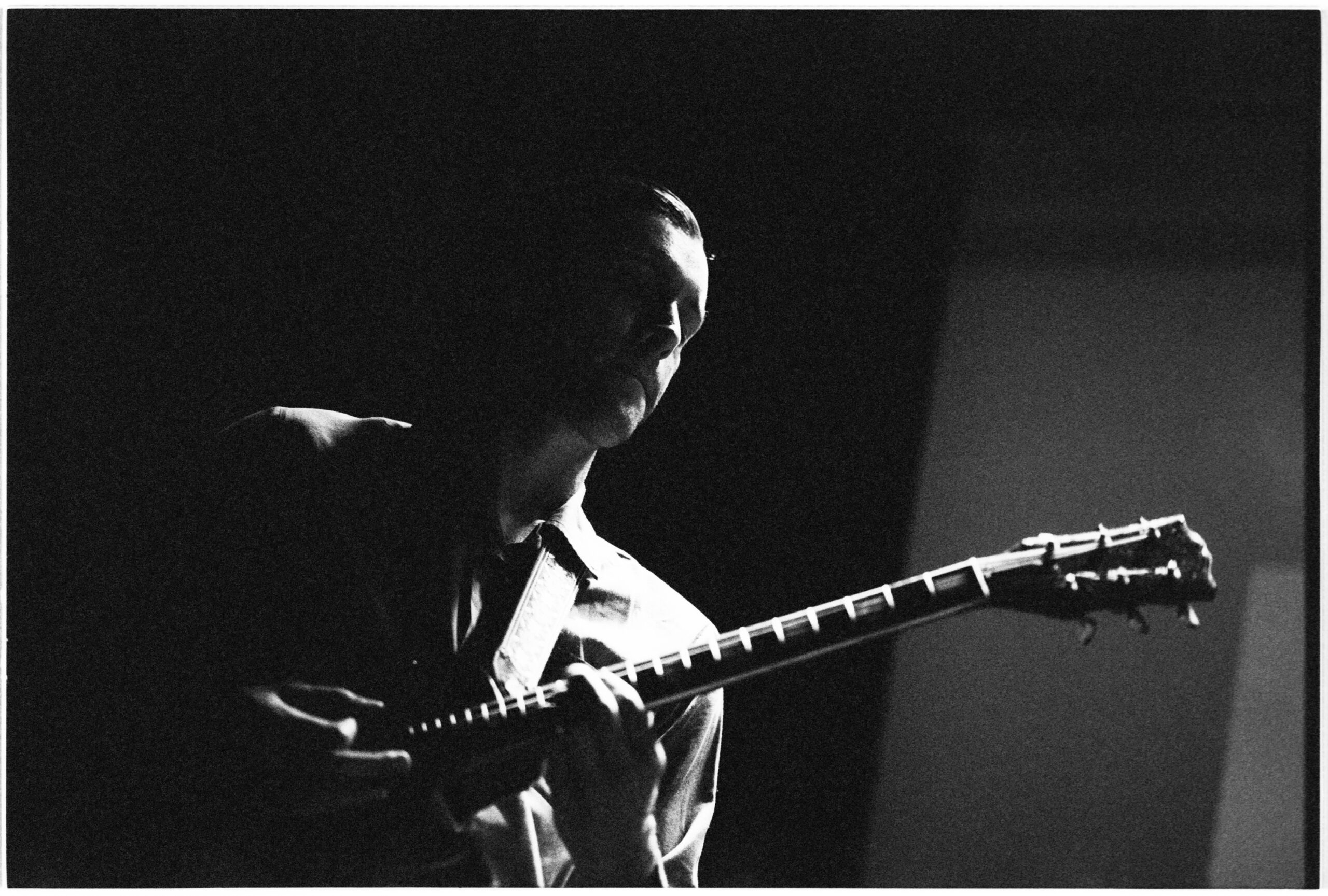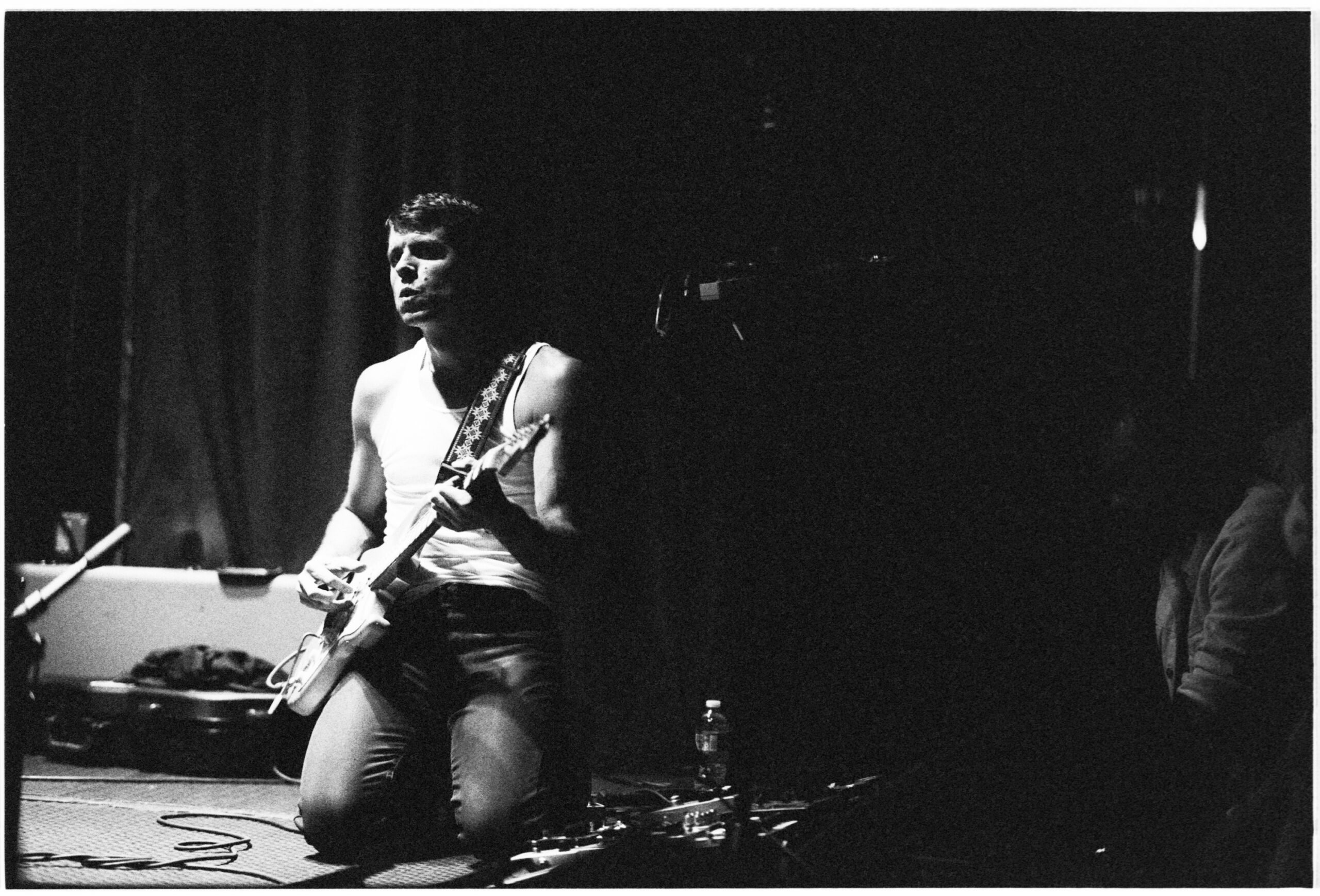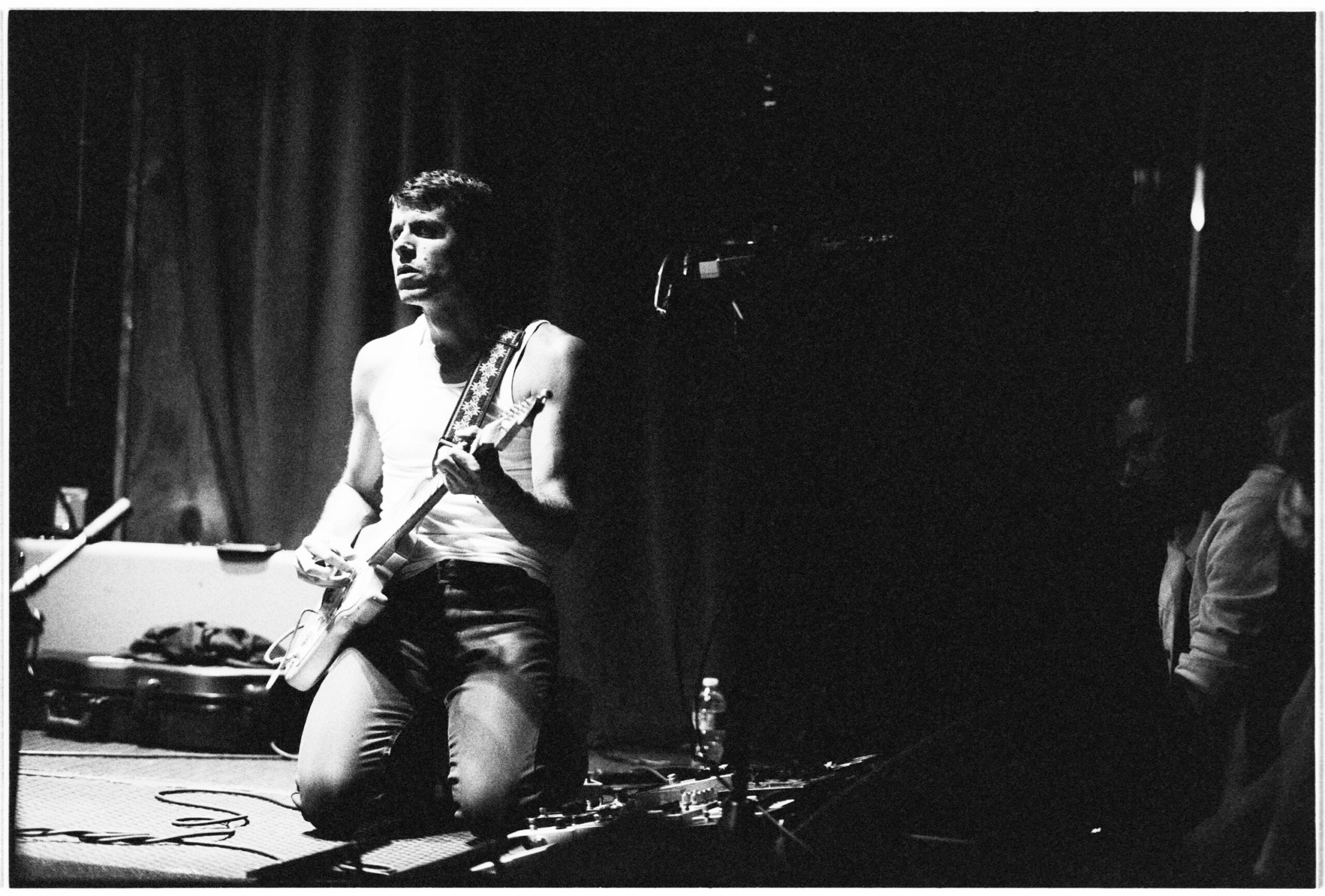 All night, he played in motion — standing up high on his toes, tossing up his right arm, hopping, falling to his knees, headbanging, and leaning back to soak the wee bit of light in the place. He drew tremendous sound from the set of Marshall amps behind him, and by the fourth or fifth song, he was down to his undershirt and dripping with sweat.