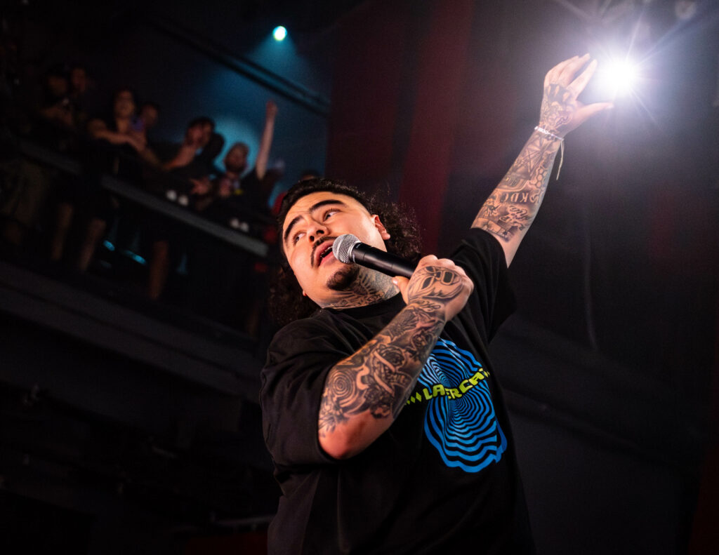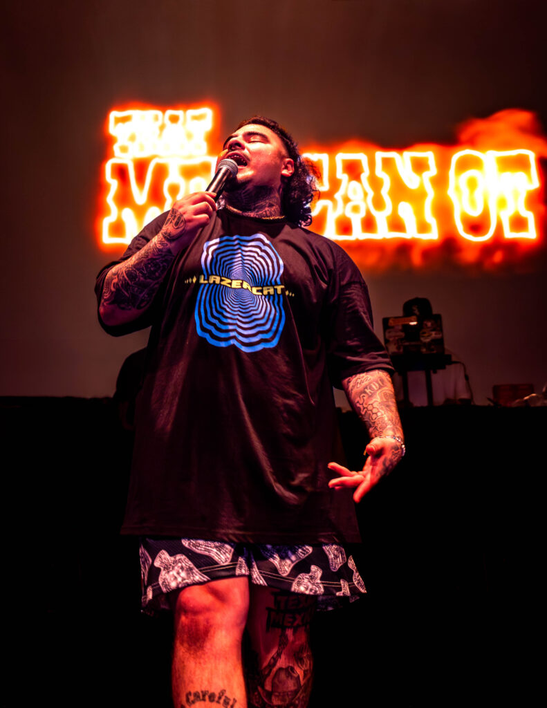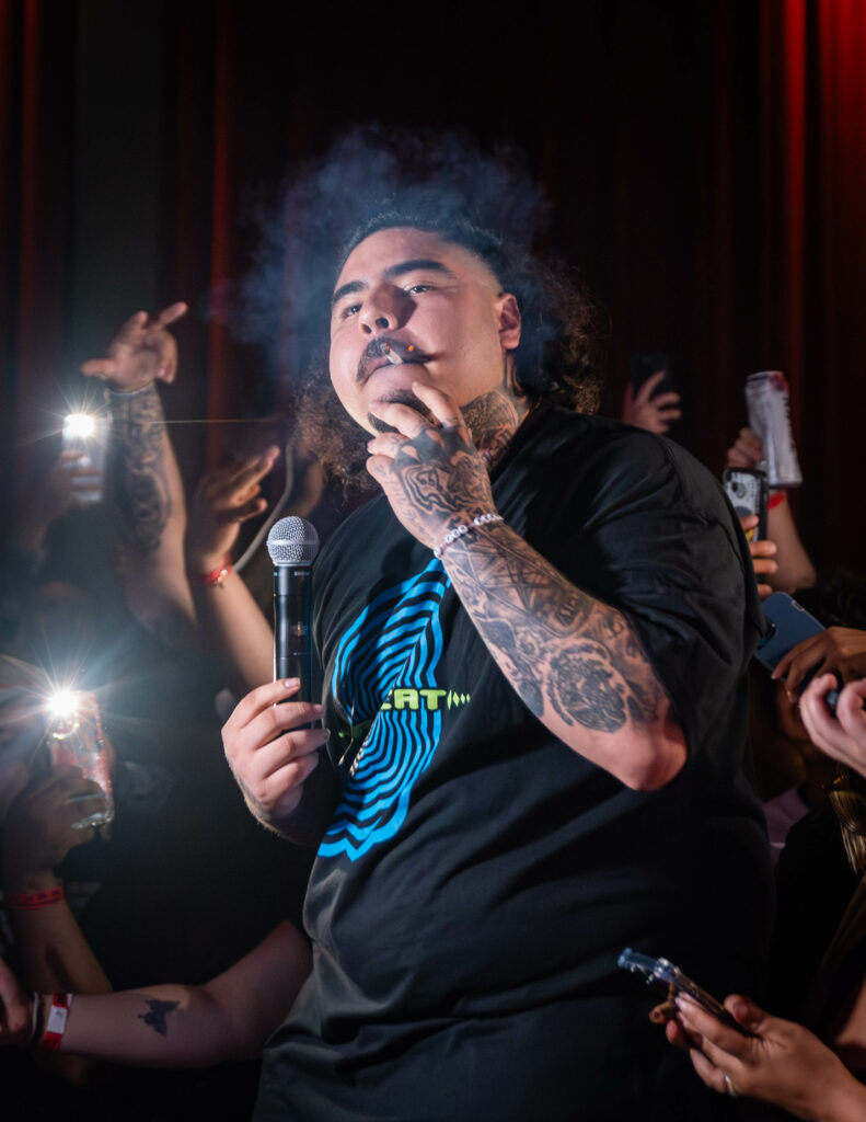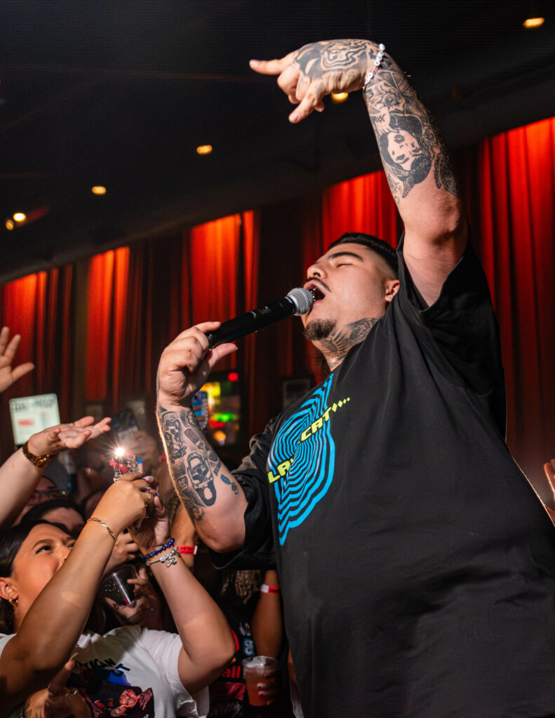 The Lonestar Luchador ran back and forth from one side of the stage to the other like a wrestler going to each turnbuckle hyping up the crowd. He soon decided to hop off stage onto the barricade to touch the people around him and feel the love. He moved all the way across the front of the room, performing in different sections of the barricade, smoking joints, recording videos on people’s phones, and signing autographs before making his way back to the stage all without missing a beat.