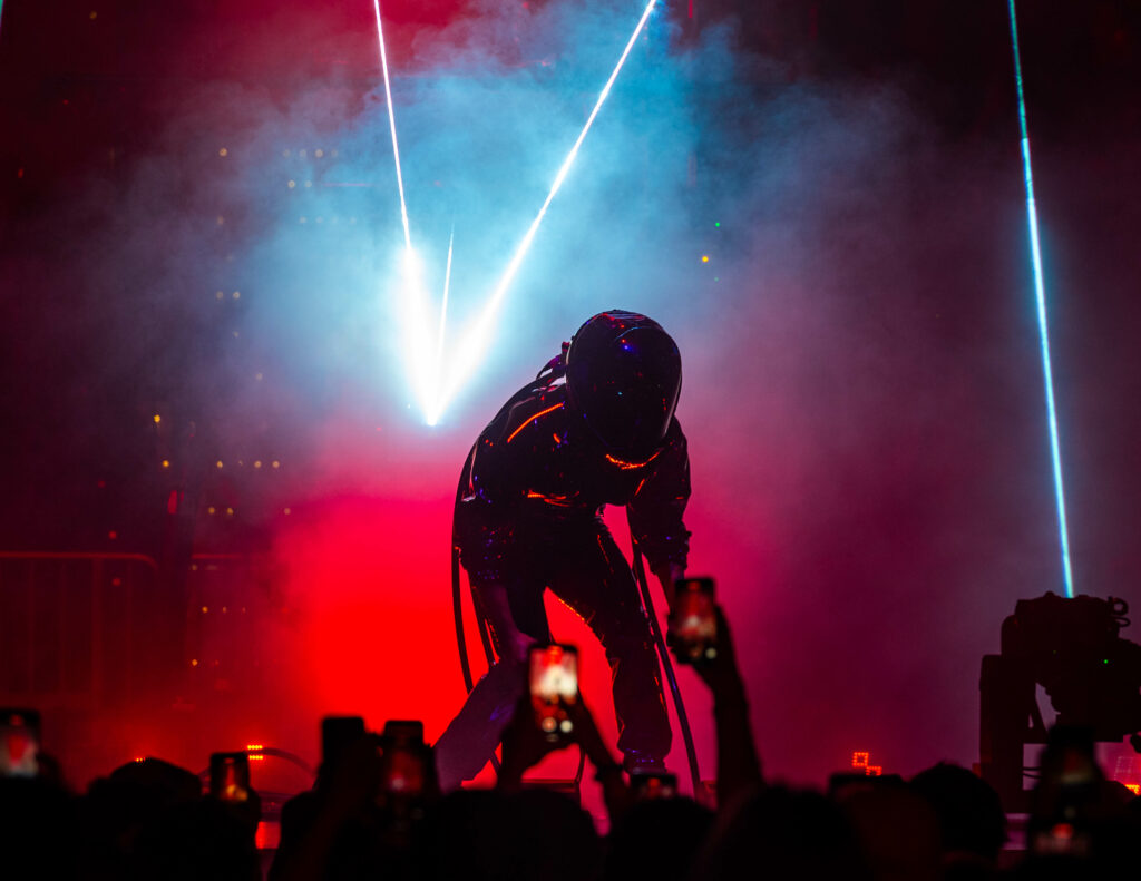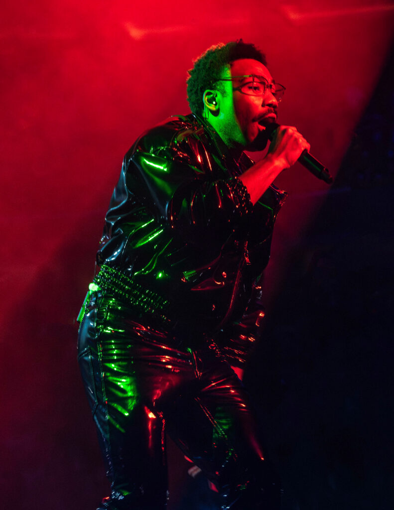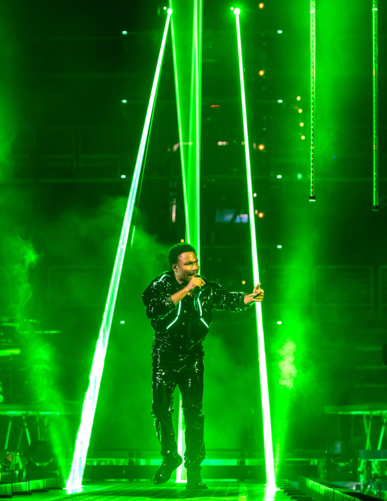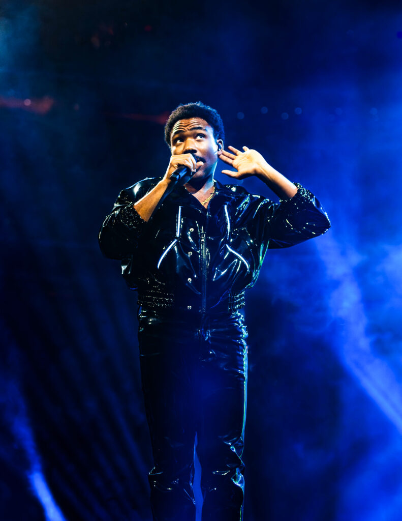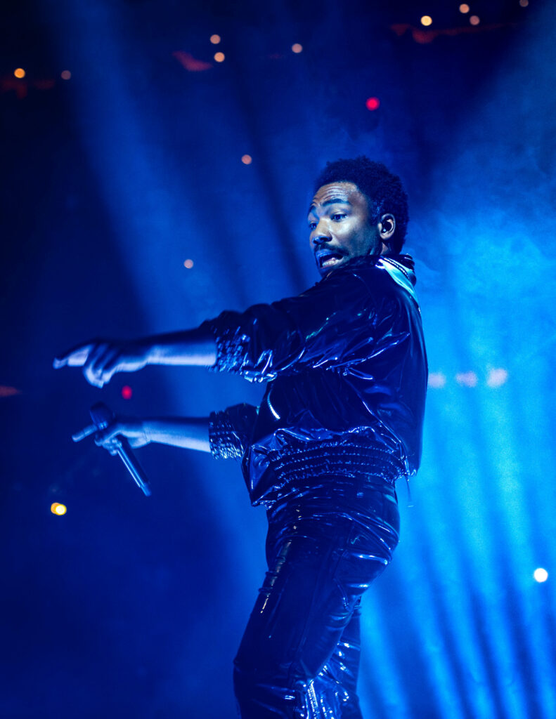 All throughout the show lights flashed and shined, while lasers of every color shot back and forth across the arena like the greatest rave you’ve ever stepped into. The incredible production and visuals were a show all their own through the entire night. Overhead at the front of the catwalk was a giant chandelier-like structure that Glover announced on his Instagram as “the Light-Binder.” The structure raised and lower above the stage throughout the entire show, changing shape and colors as its lights danced to the music. It even projected Glover’s face as he performed “Cruisin’” as a hooded Yeat, who is featured on the record appeared on the screens like Darth Sideous making a call in Star Wars. The screens also followed along and presented the lyrics to some of the songs as Gambino performed — so even the first-timers could rap and sing along.