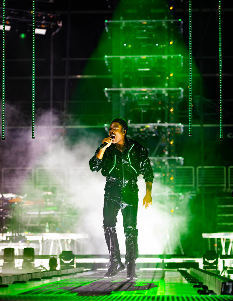 The lights and fog billowed out from behind Gambino forming into a giant rainbow fog creating his silhouette as the band started to play “Redbone” from Awaken, My Love! He stepped out of the fog and sang the song as he slowly walked up the catwalk to the front of the stage. He finished the night off with “Letter Home” from his Camp album before thanking everyone one last time and heading off stage. “Real Love” started to play as video game style credits began rolling on all the screens, giving the band any everyone backstage their time to shine.