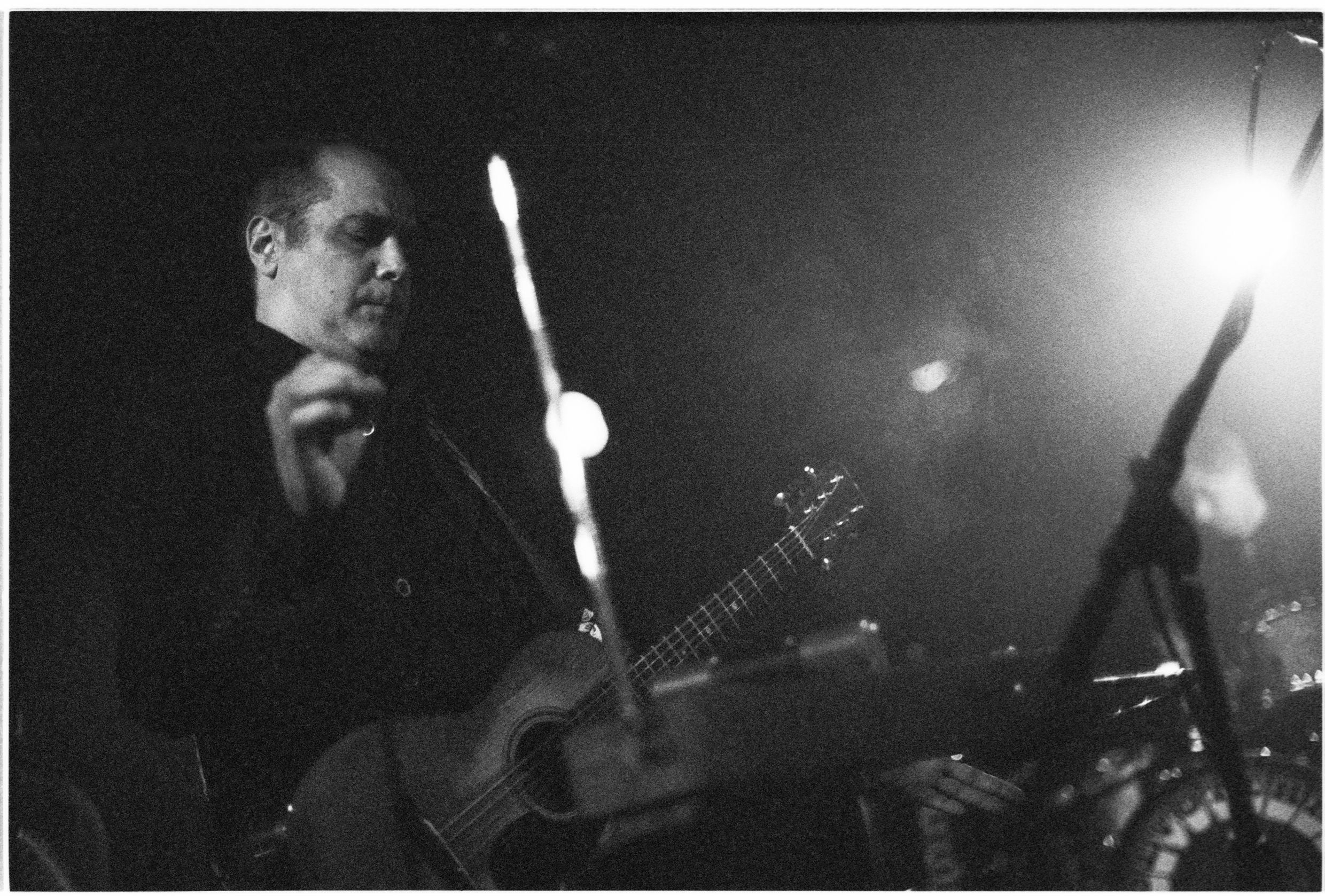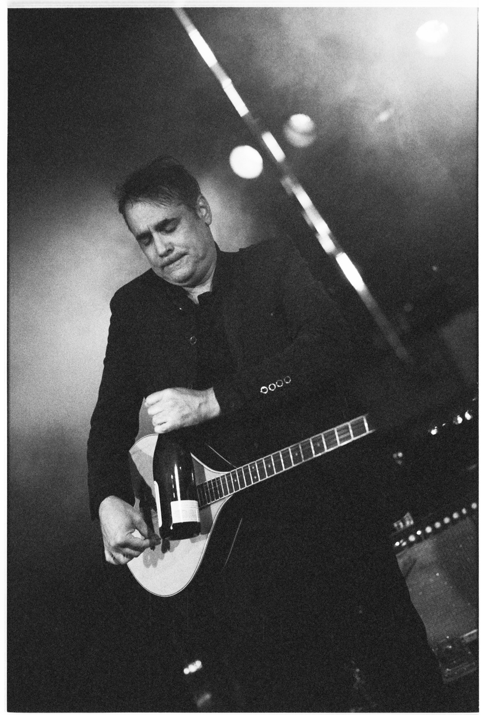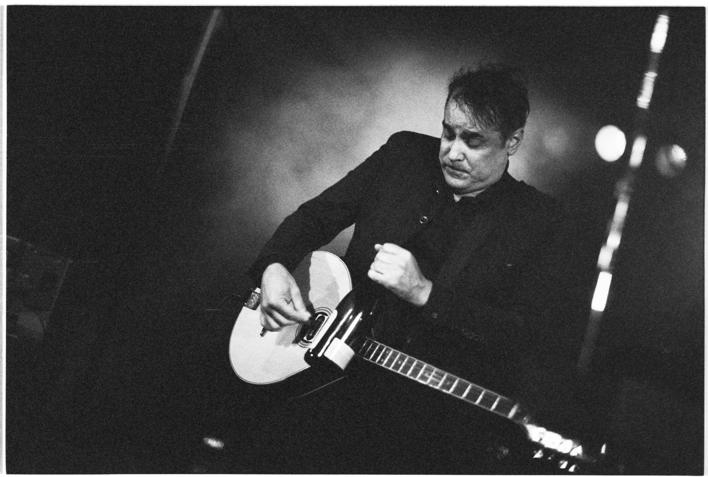 Nick Urata of Denver-based DeVotchka bows behind his bouzouki at Black Cat on Sept. 14, 2024. (35mm film photo by Casey Ryan Vock)