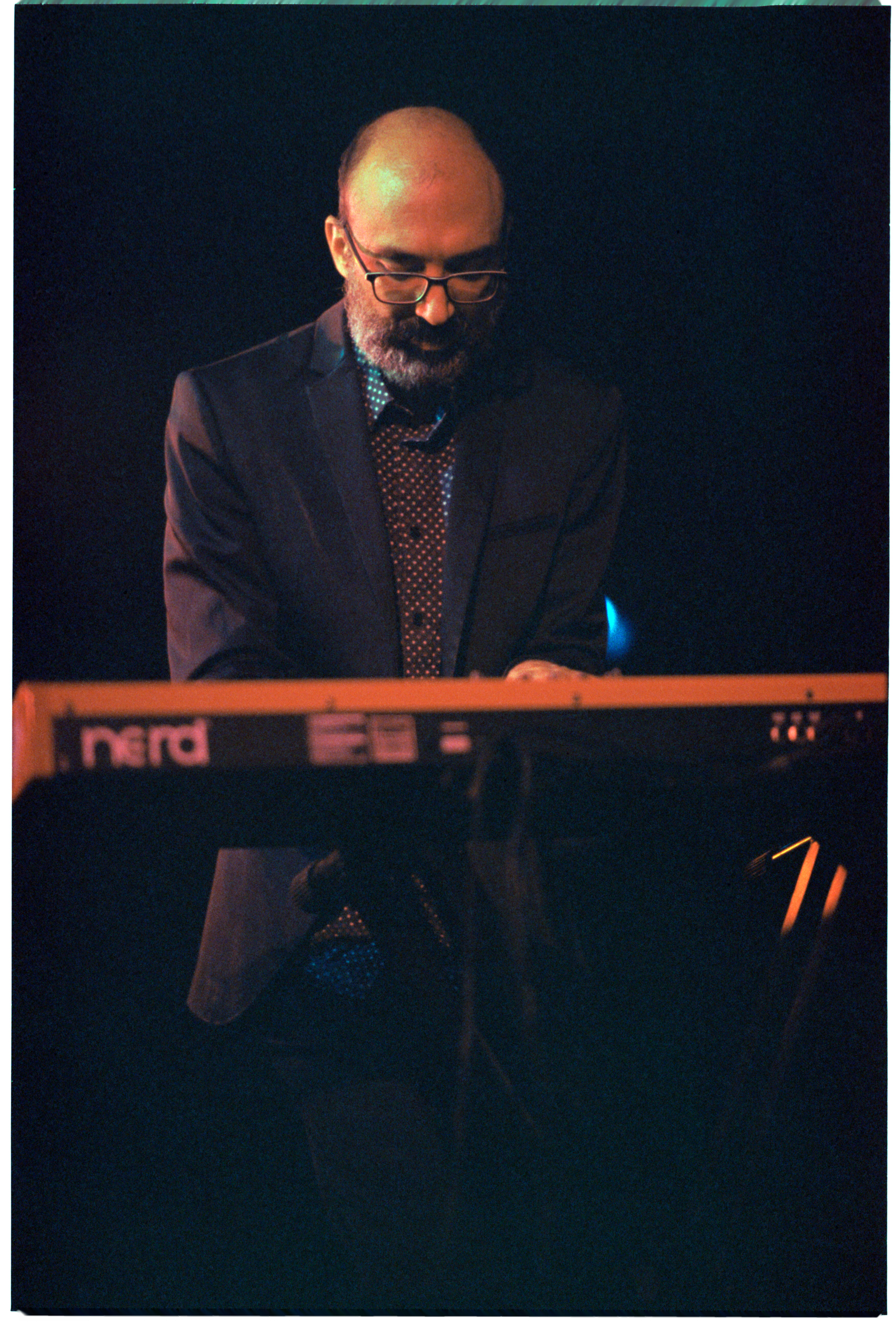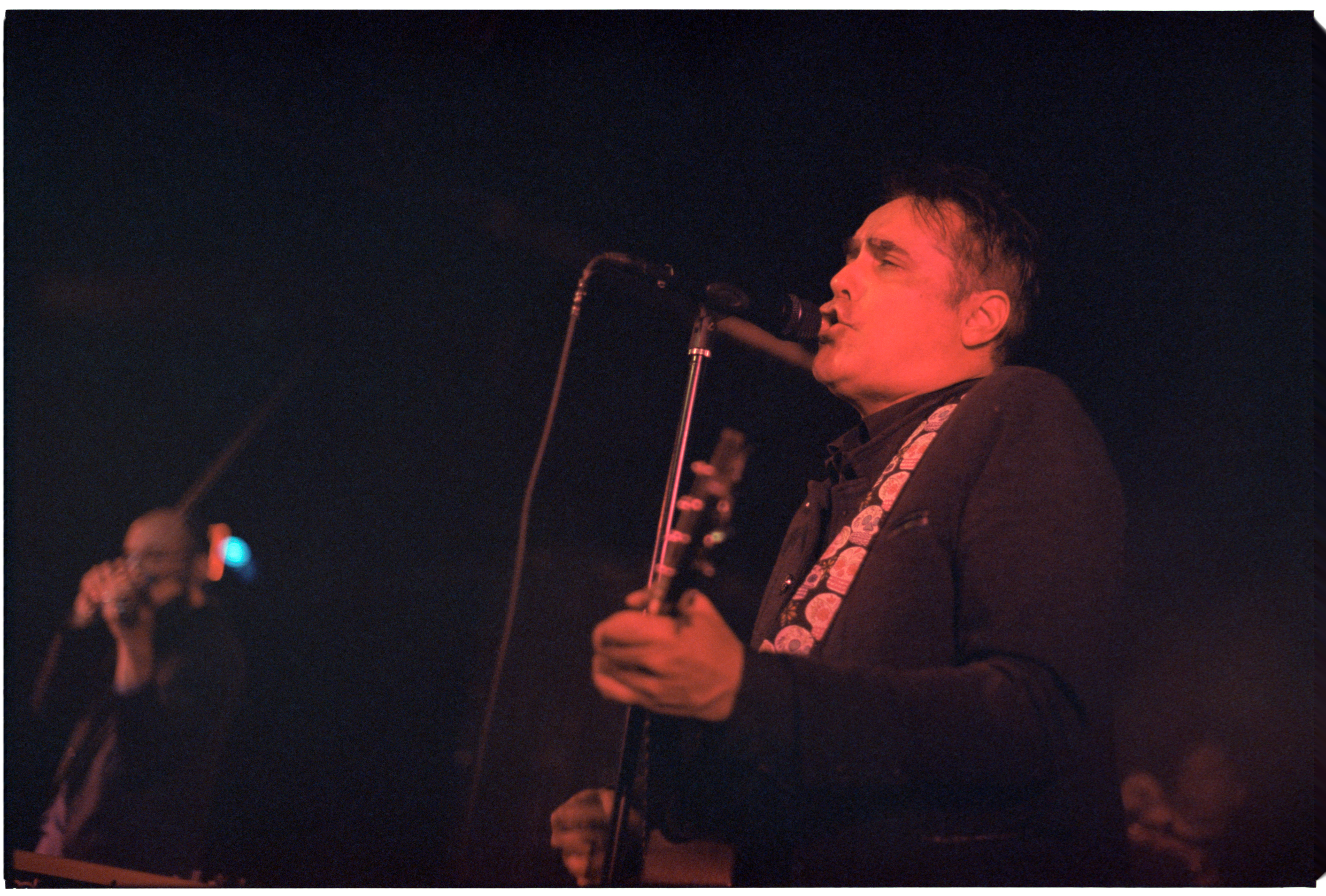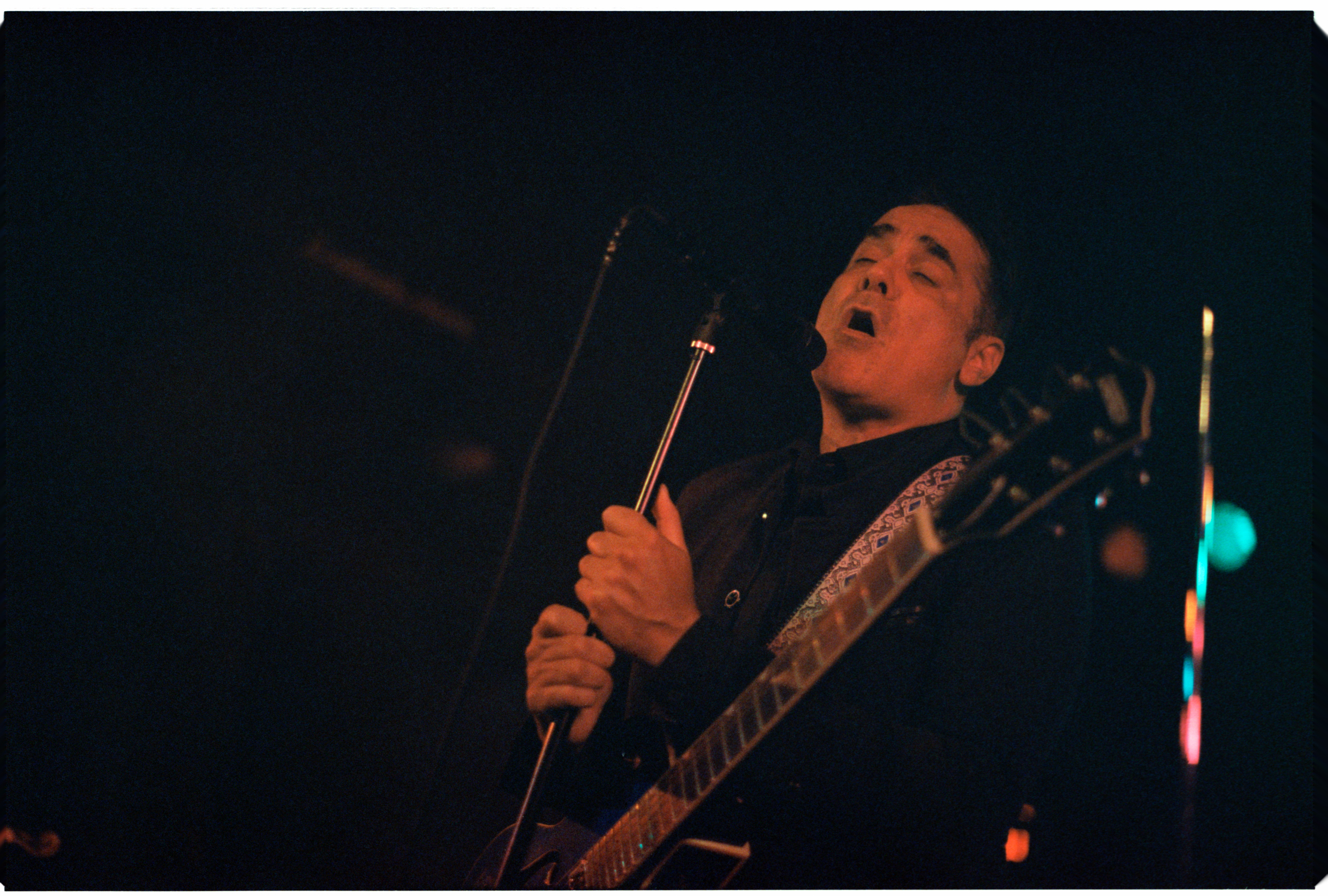 Nick Urata of Denver-based DeVotchka bows behind his bouzouki at Black Cat on Sept. 14, 2024. (35mm film photo by Casey Ryan Vock)